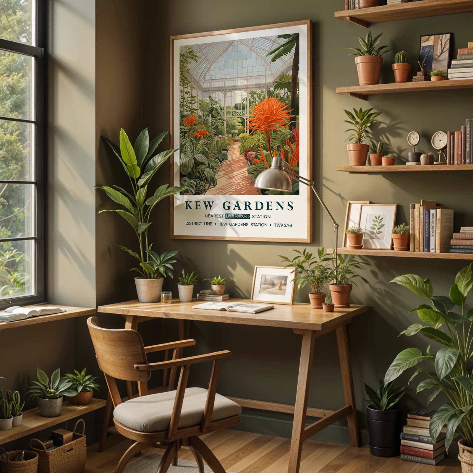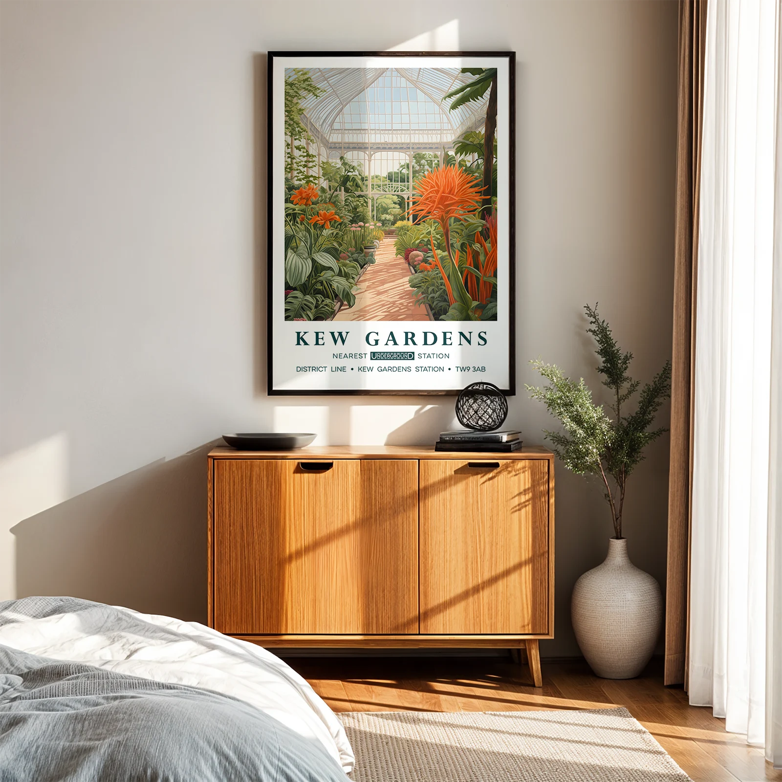 Bright and full of life, this Kew Gardens poster is inspired by the decorative elegance of William Morris and his love for nature. The sunlit glasshouse filled with lush greenery and vibrant orange blooms creates a fresh and uplifting atmosphere for a living room, hallway, or office. Soft light, rich plants, and graceful architectural lines bring depth and calm into your space, while the high quality paper ensures every detail is beautifully clear. Add timeless botanical charm with this Kew Gardens poster inspired by William Morris.