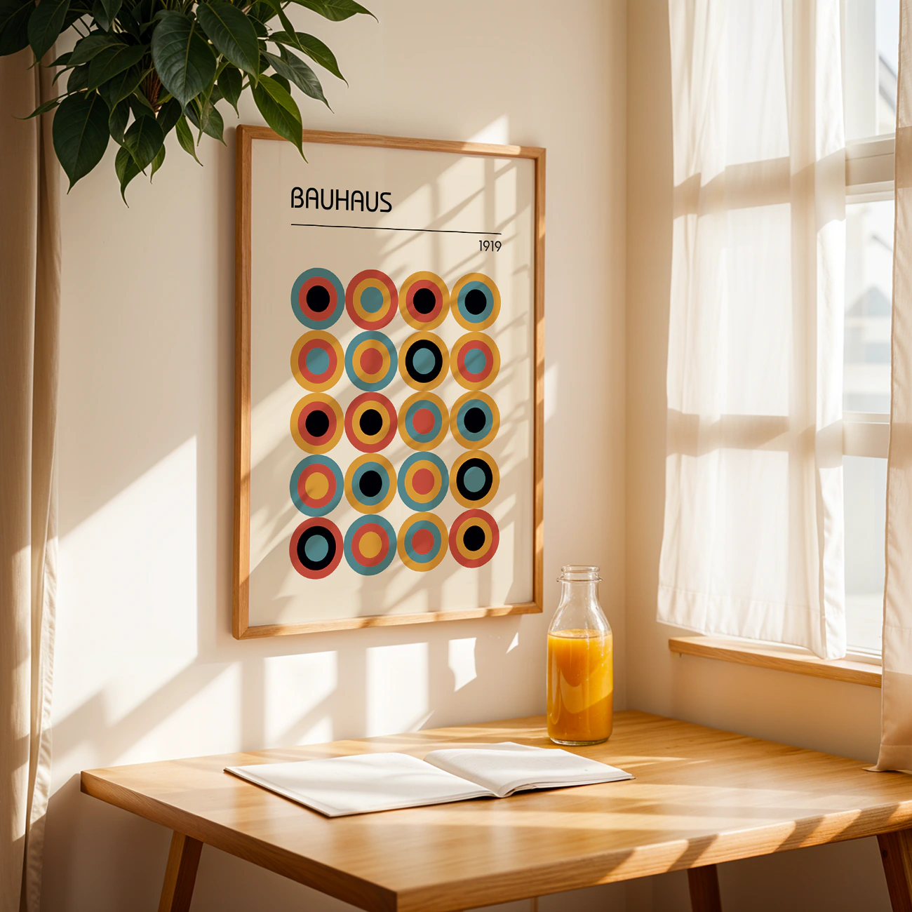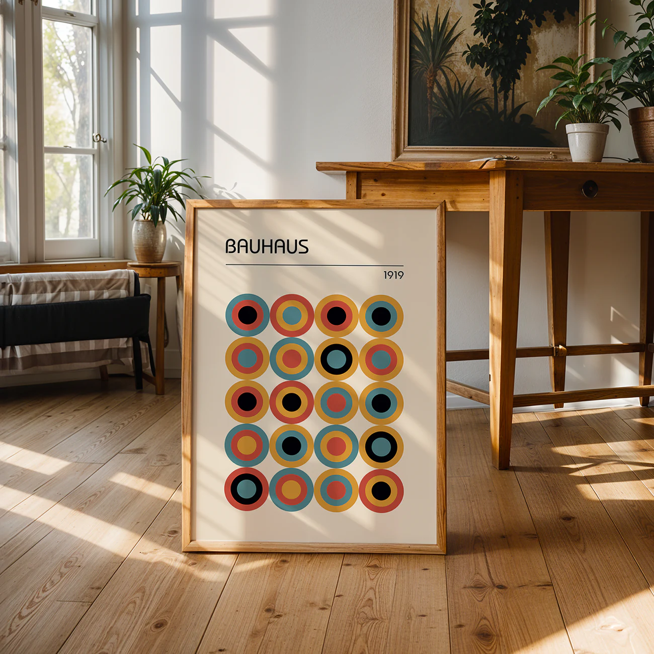 This modernist art print is all about balance and boldness—twenty colorful circles lined up in a way that feels both playful and perfectly ordered. The headline “BAUHAUS” and the subtle “1919” up top give a nod to design history, but the crisp lines and rich palette keep it feeling fresh and current. It’s the kind of minimalist Bauhaus poster that instantly brightens up a living room, office, or creative space without overwhelming it. Hang this modernist art print where you want a pop of color and a little bit of design inspiration—simple, striking, and always in style, just like the best minimalist Bauhaus poster.