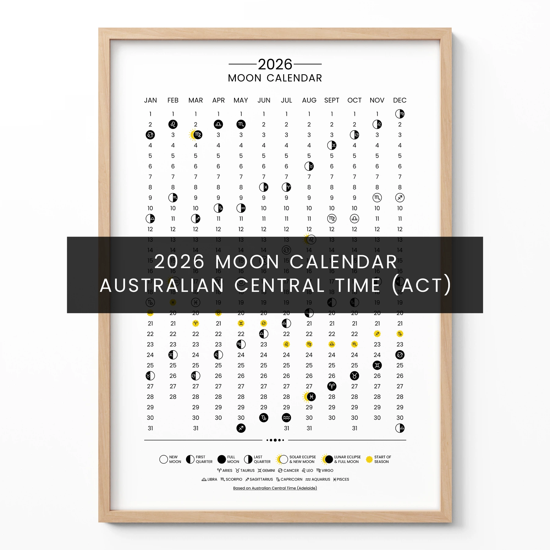 Moon Calendar Print – 2026 Australian Central Time Lunar Poster