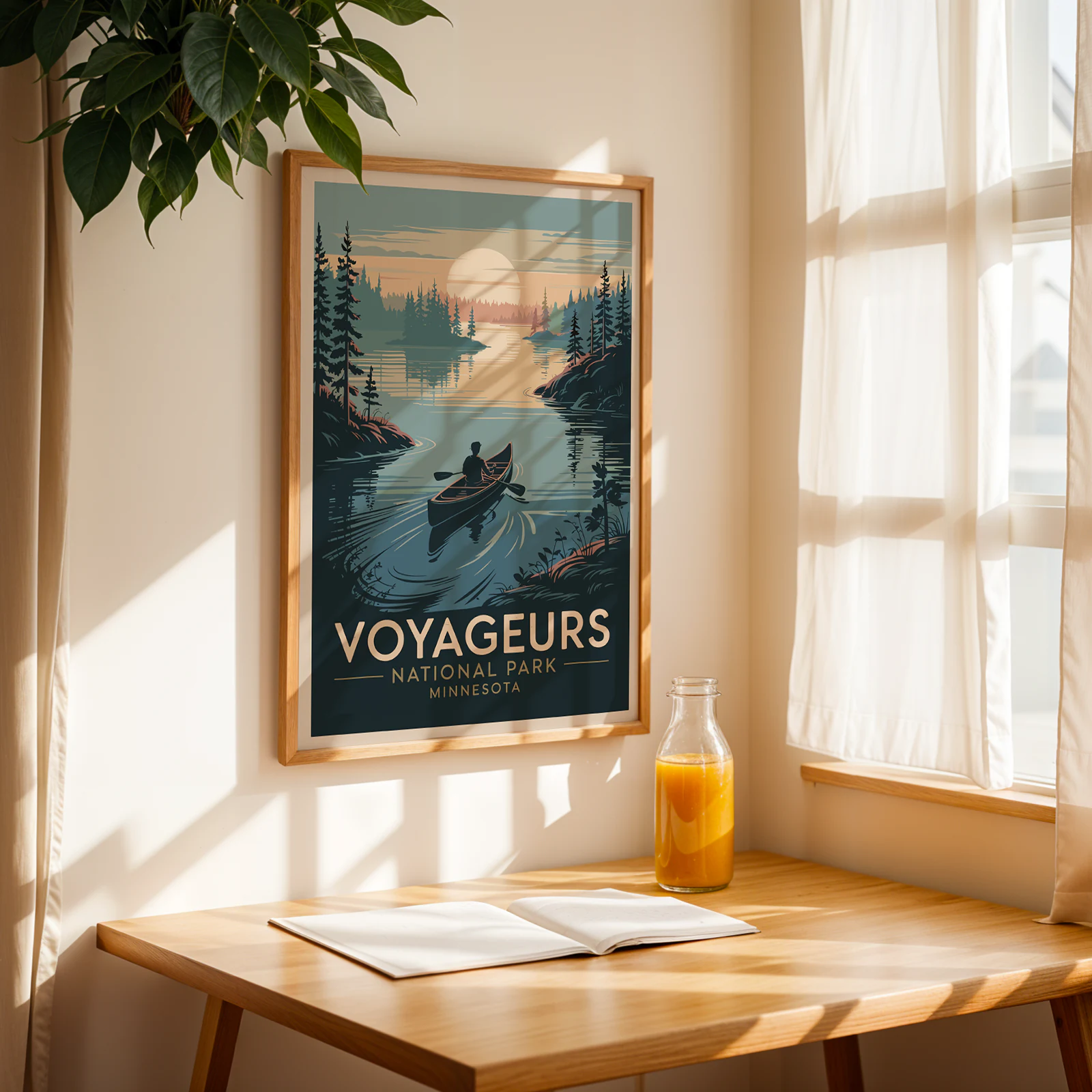 This national park poster is the kind of thing that makes you want to pack up and chase the sunset. One look and you’re right there: a single canoe gliding through glassy water, pine trees crowding the shore, and the sky going soft gold as the sun drops behind the islands. It’s got that old-school adventure vibe, but the colors are rich and moody—perfect for anyone who dreams of quiet lakes and long evenings outdoors. Hang this national park poster in your living room, office, or anywhere you need a reminder that the best escapes are sometimes just a paddle away.