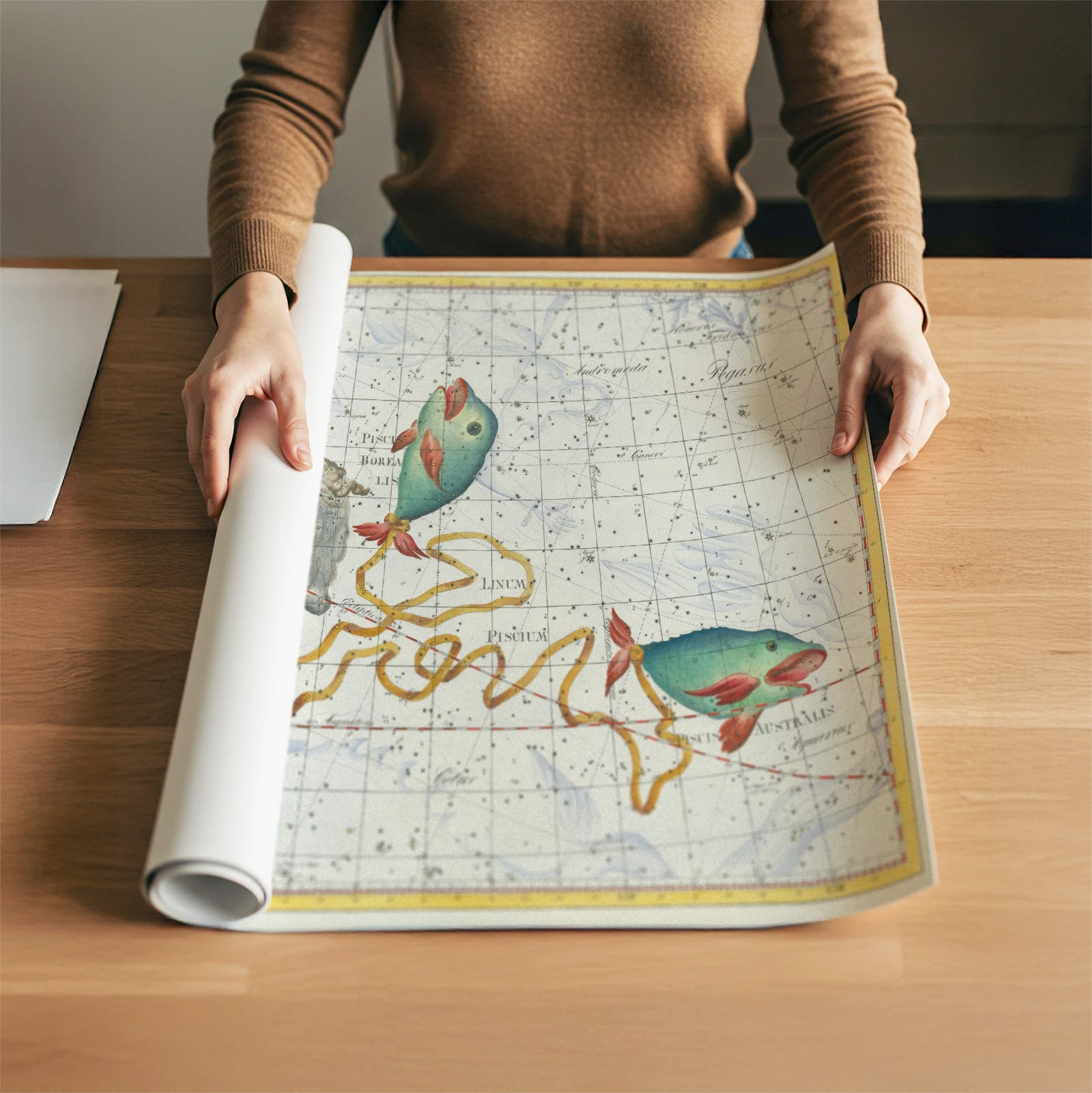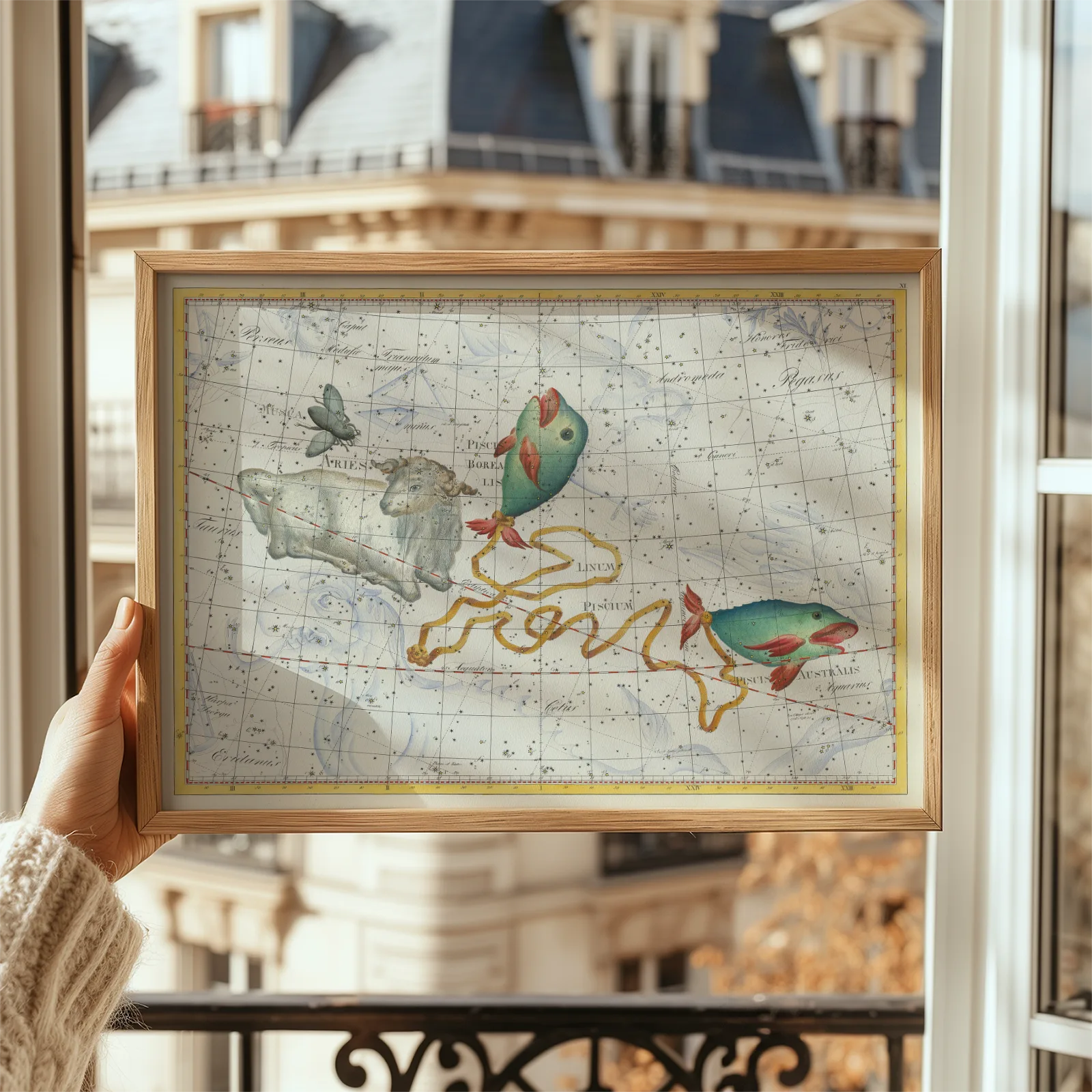 This elegant celestial artwork captures the beauty of the Pisces constellation in a detailed early 19th century illustration created by a German artist, astronomer, and mathematician. The two fish connected by a flowing ribbon, soft sky tones, and delicate star grid give the print a light and refined feeling. It fits beautifully in a bedroom, living room, or quiet study where you want a calm and thoughtful atmosphere. Printed on high quality paper, this timeless Pisces constellation poster brings vintage sky magic into your home.