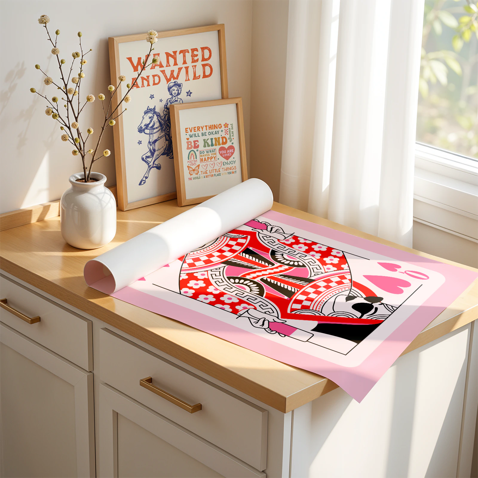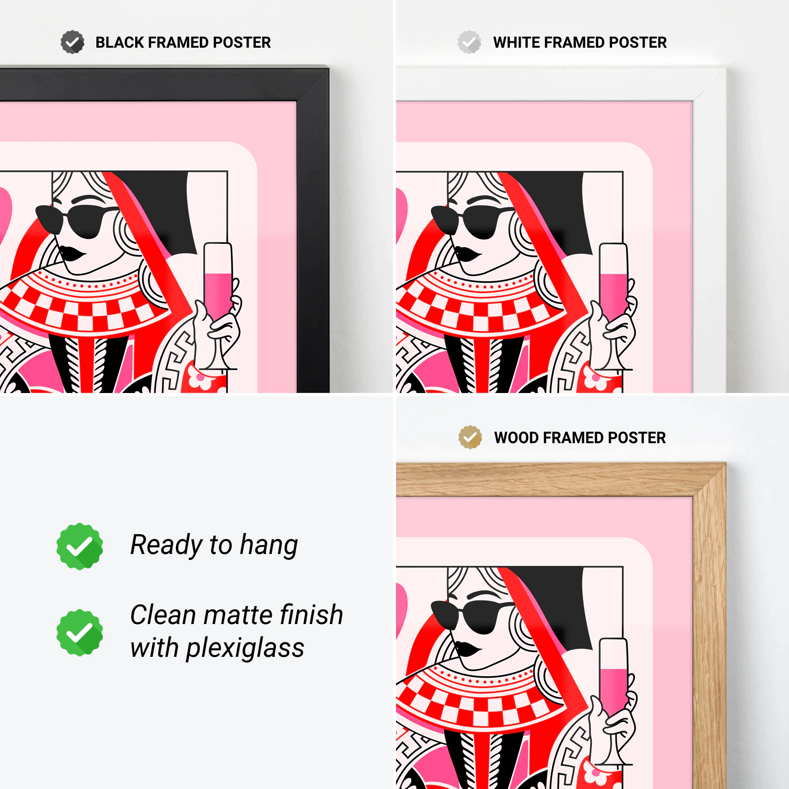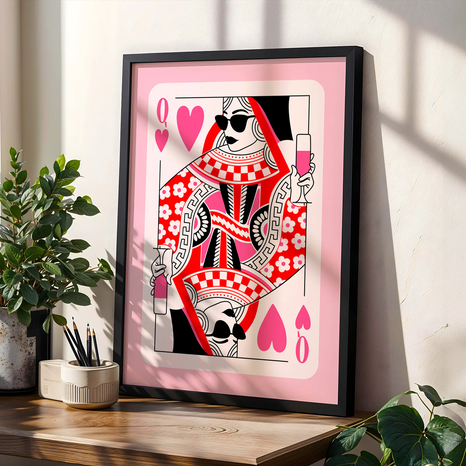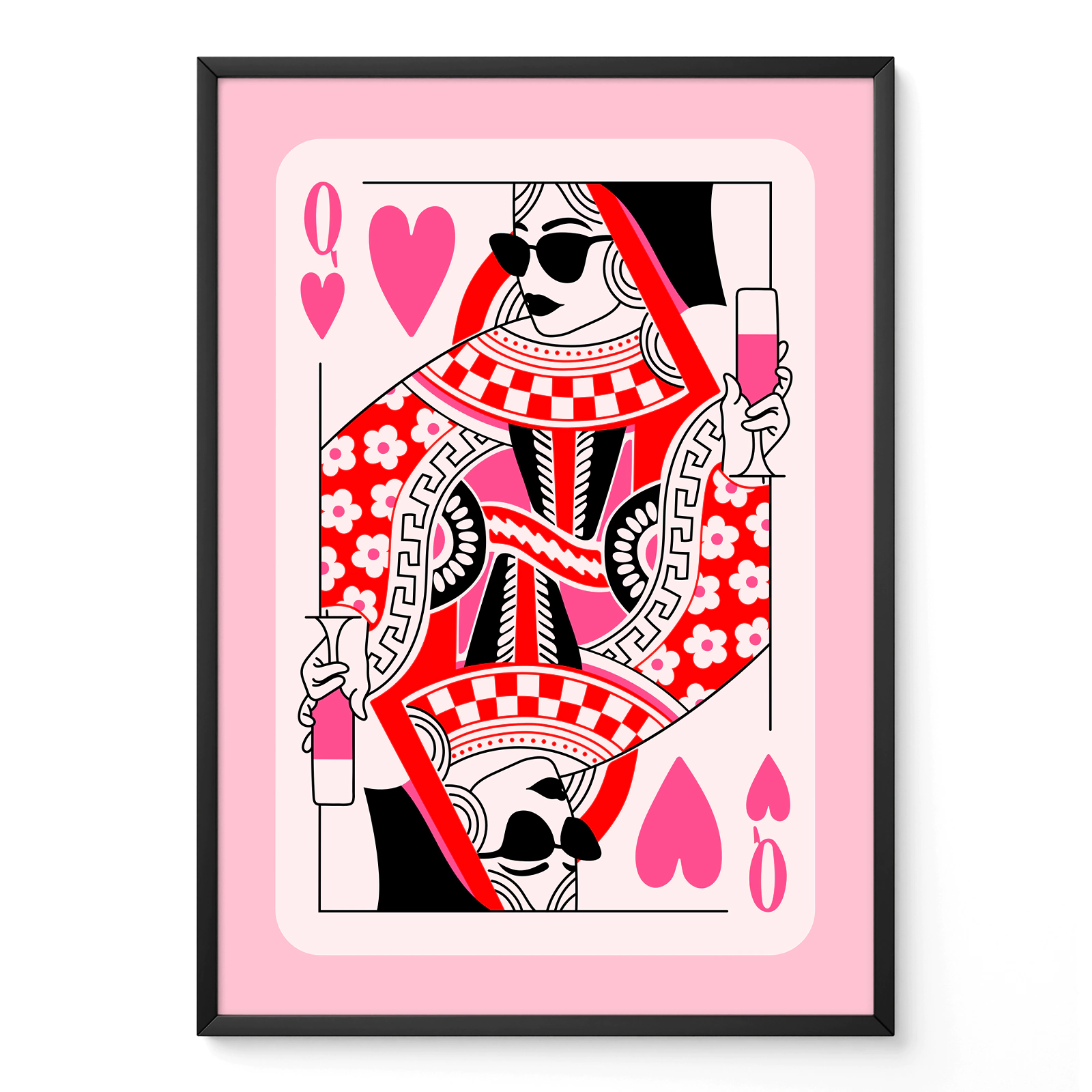 Looking to add some fun and bold style to your space? This playing card wall art features a modern take on the Queen of Hearts with bright red, pink, and black colors. She’s holding a drink and wearing sunglasses – a true queen with attitude! This playing card wall art is perfect for game rooms, bedrooms, or any room that needs a pop of personality. Printed on high-quality matte paper, it’s ready to bring some playful vibes to your wall.