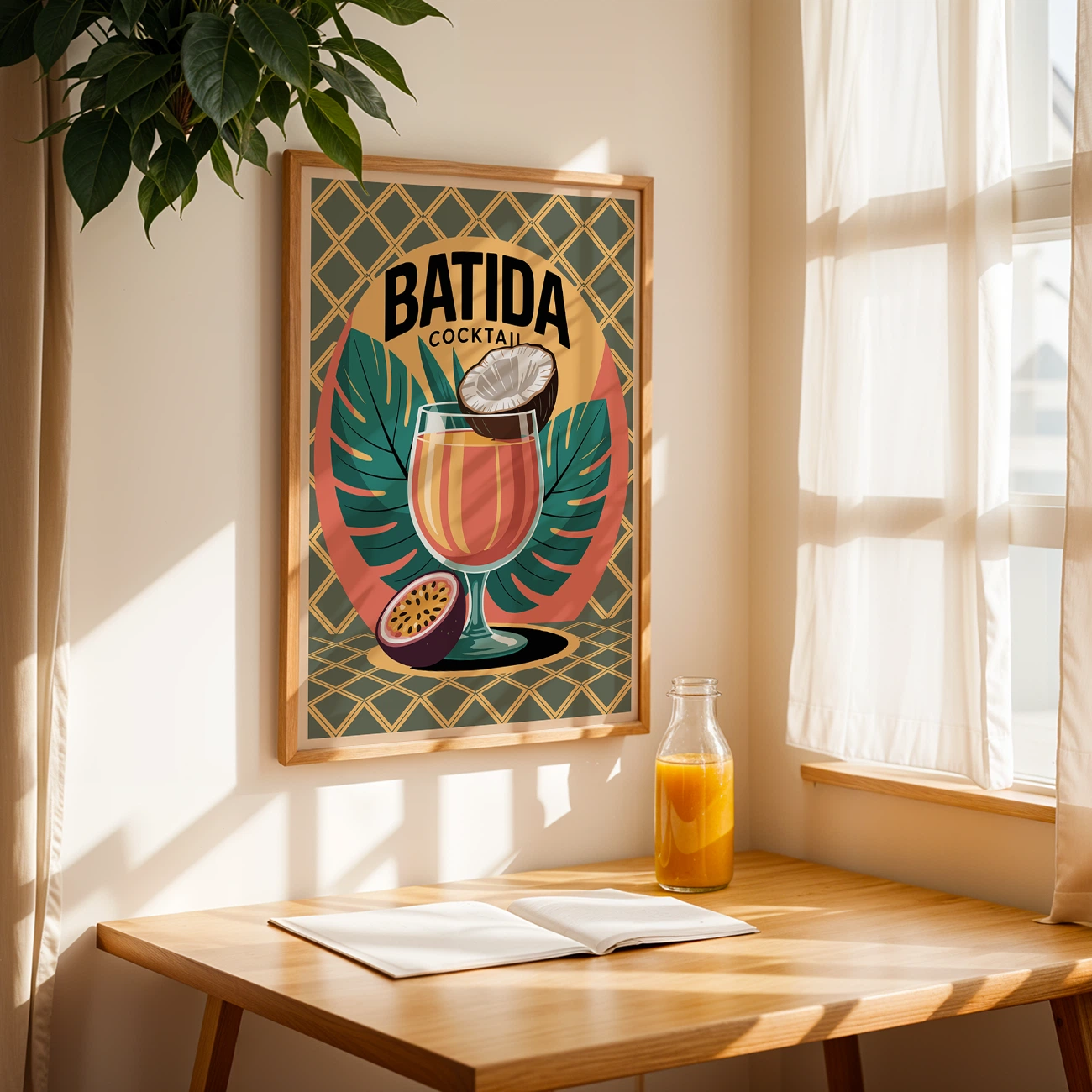 This print of cocktail captures the tropical essence of Brazil’s beloved Batida. Featuring vibrant tones, exotic fruits like coconut and passionfruit, and bold jungle leaf patterns, this poster is a true showstopper. It’s perfect for brightening up home bars, summer kitchens, beach cafés, or any space craving tropical vibes. Printed on matte paper, this artwork blends high-quality materials with playful design. Whether you’re a fan of tropical drinks or bold interiors, this print of cocktail brings fun and freshness straight to your wall.