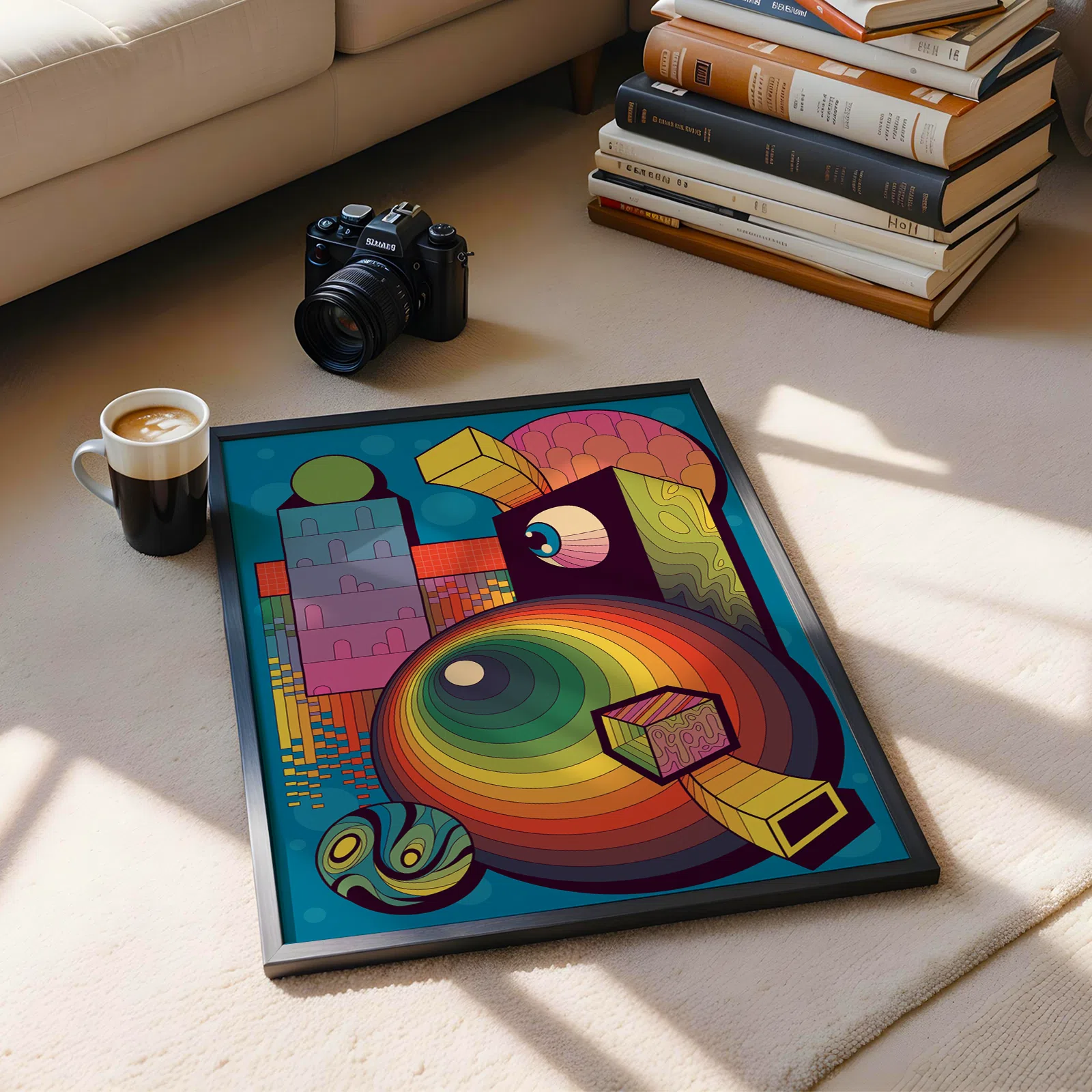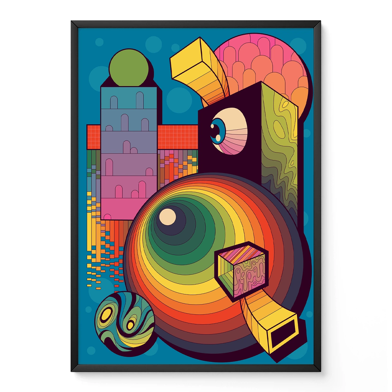 This psychedelic art print is a colorful explosion of shapes, textures, and visual illusions. With swirling circles, blocky structures, and bold contrasts, it captures the feel of 70s psychedelia in a modern way. Ideal for creative studios, music rooms, or eclectic interiors, this design adds energy and imagination to any wall. Printed on thick matte paper, it offers both vibrant color depth and long-lasting quality. Whether you love abstract visuals or retro trippy vibes, this psychedelic art print is a true conversation starter.