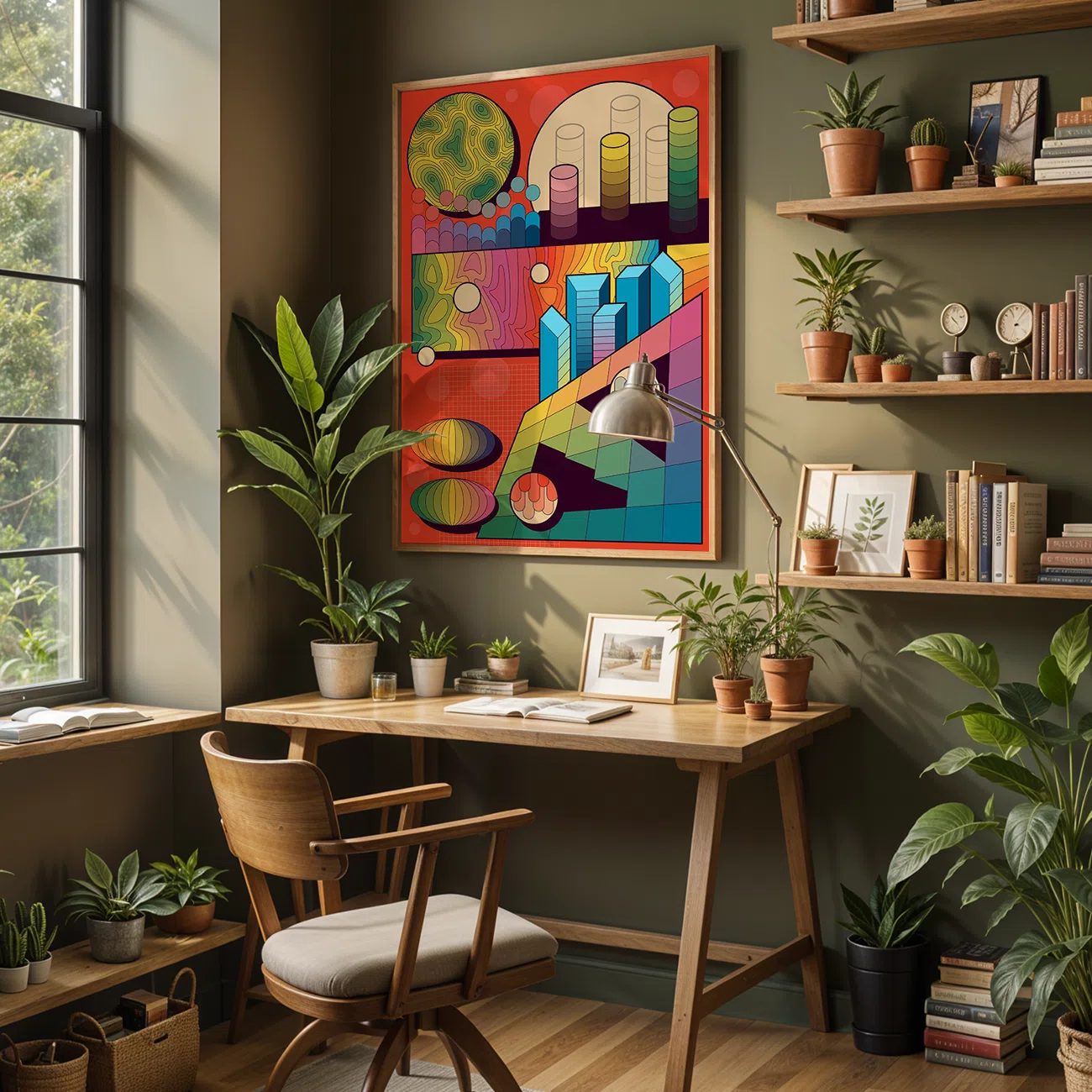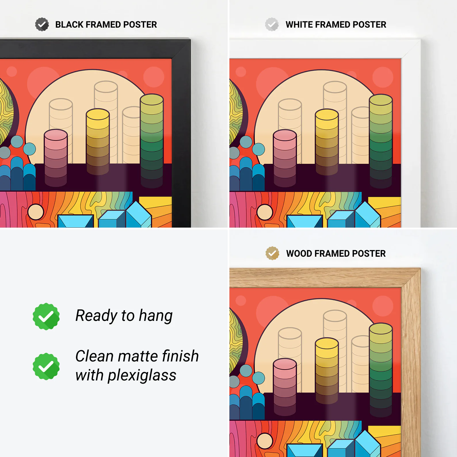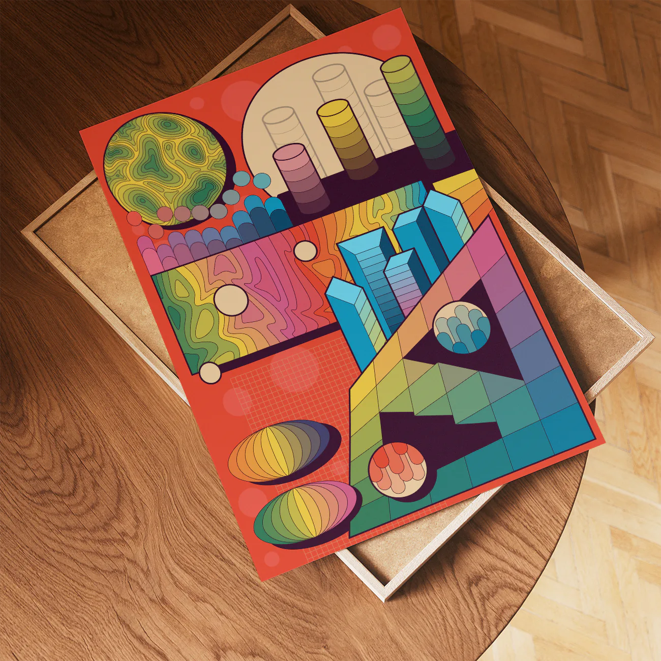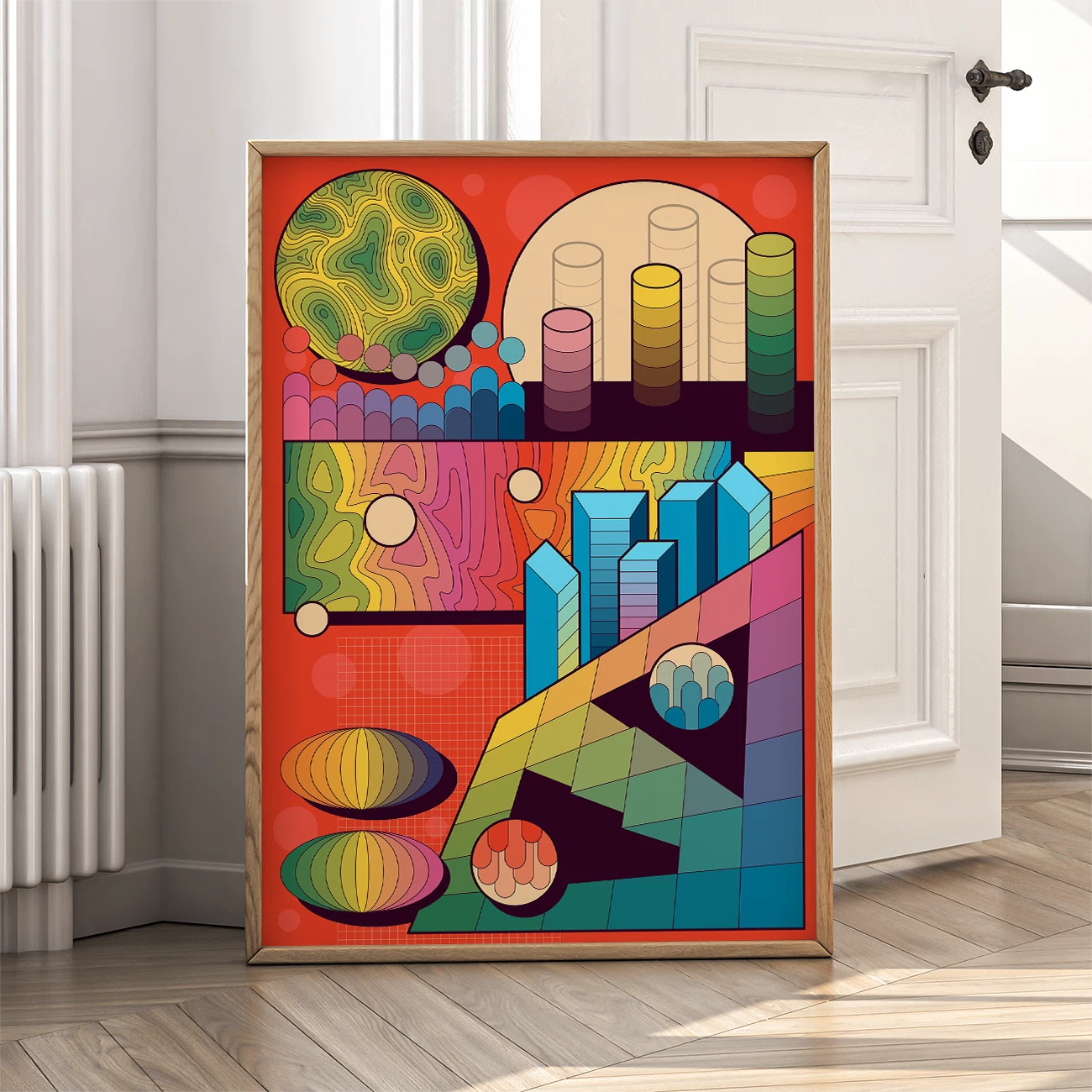This psychedelic poster features a mind-bending composition of vibrant shapes, layered patterns, and surreal color transitions. With stacked cylinders, retro textures, and shifting perspectives, it brings instant energy and character to any room. Ideal for creative studios, music spaces, or anyone who loves bold, abstract design. Printed on thick matte paper, the quality matches the intensity of the artwork. Whether you’re into retro-futurism or visual experimentation, this psychedelic poster is made to catch the eye.