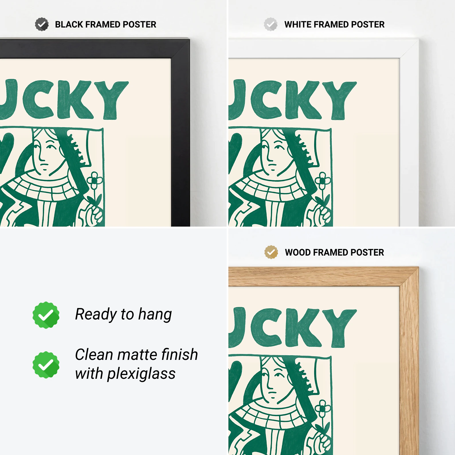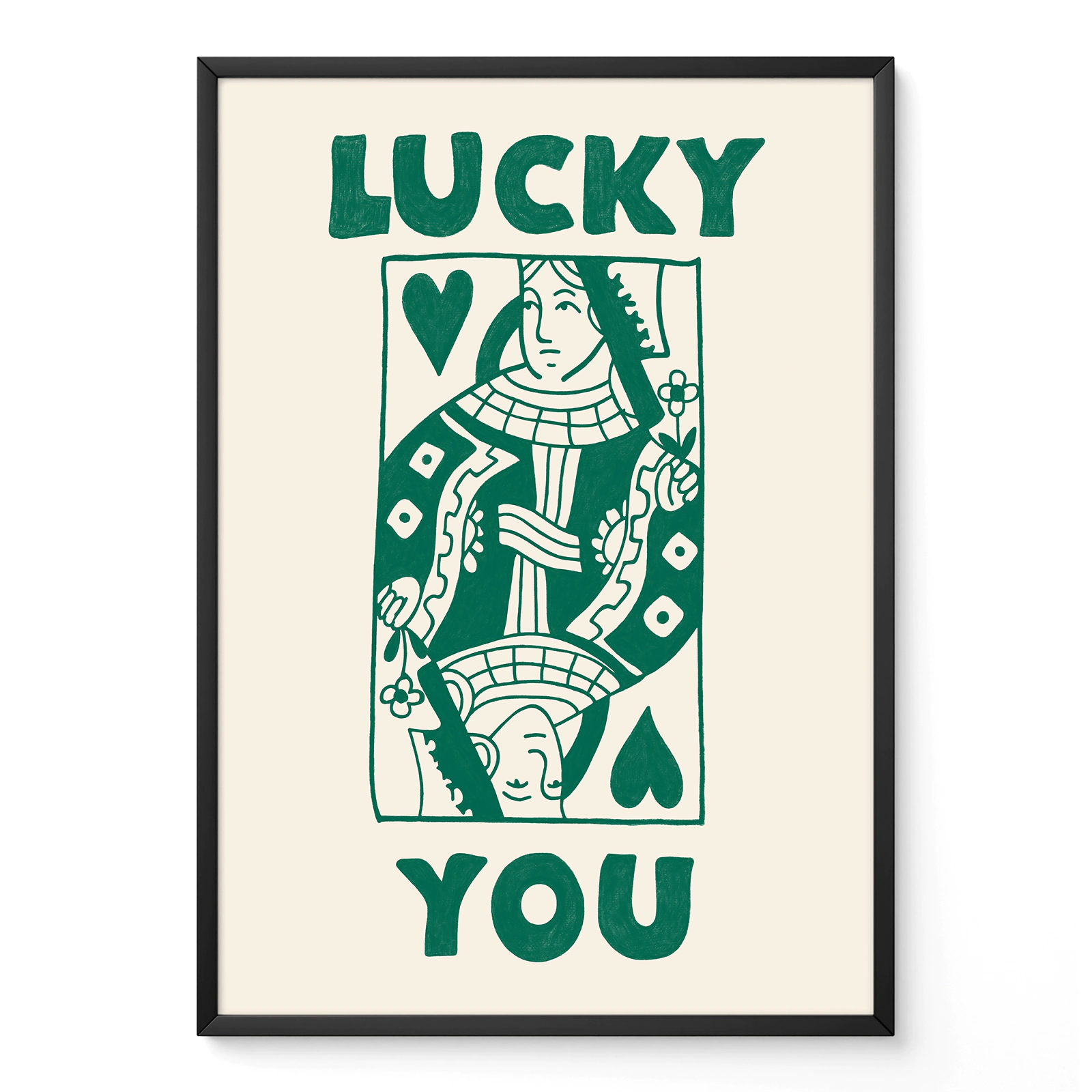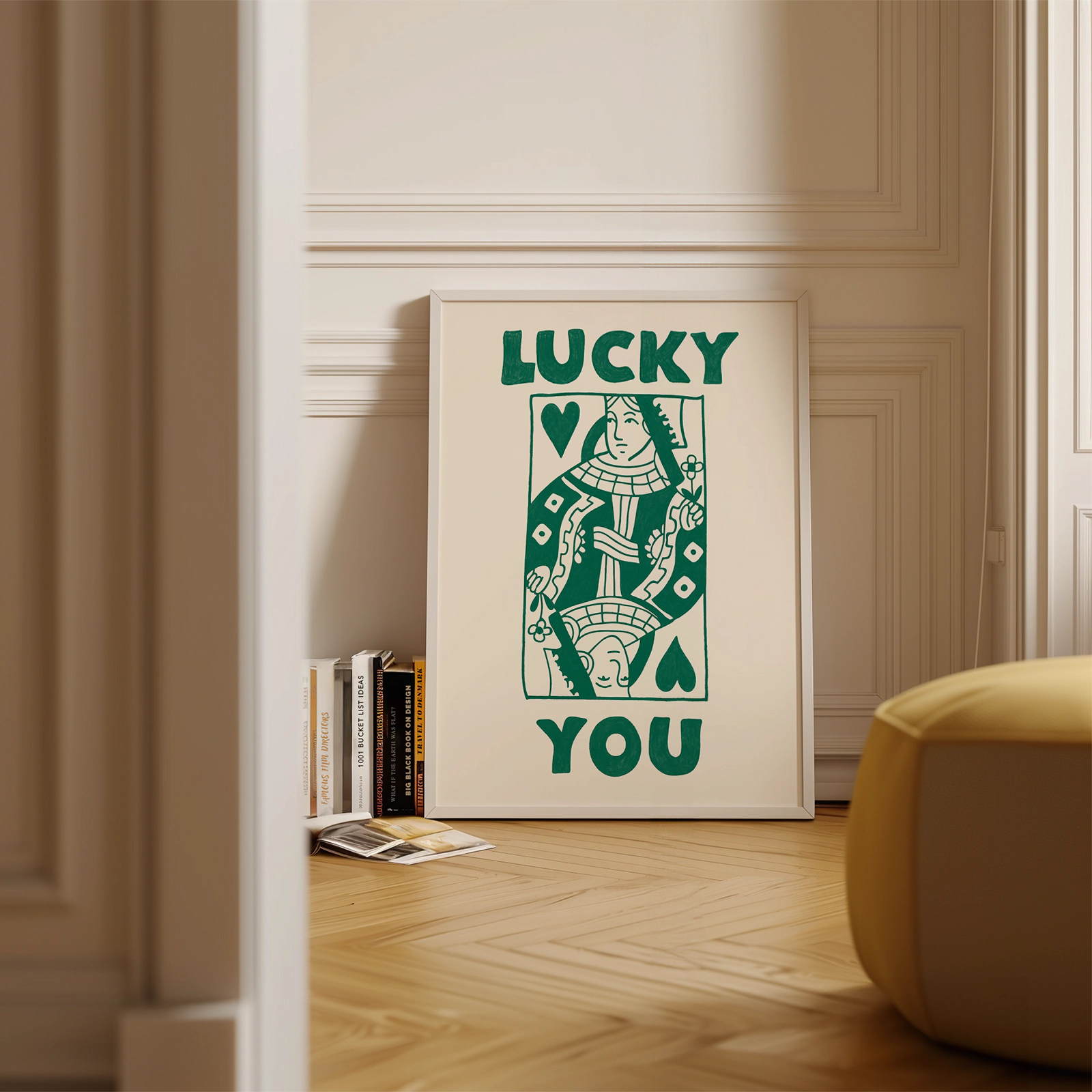 Bring playful charm to your space with this queen card poster featuring a bold and funky Lucky You art print. Inspired by vintage playing cards, this eye-catching design adds a fun and stylish touch to any room. Perfect for game rooms, bedrooms, or as a quirky gift, this wall art blends retro vibes with a modern twist.