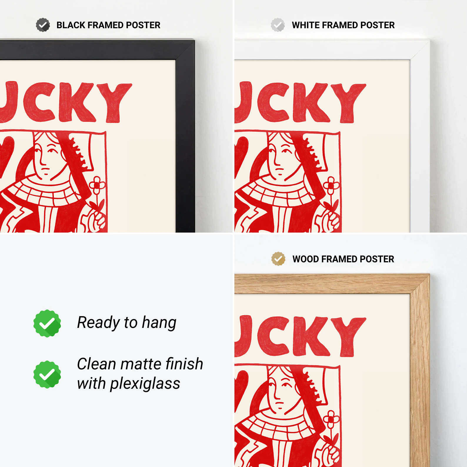 This red queen wall print features a striking queen of hearts playing card illustration in vivid red with the playful phrase “Lucky You.” The red queen wall print is ideal for anyone who loves graphic, contemporary decor and wants to bring a touch of luck and personality to their space. It’s a standout accent for bedrooms, living rooms, or offices, and makes a memorable, eye-catching gift for birthdays, anniversaries, or to simply brighten someone’s day.