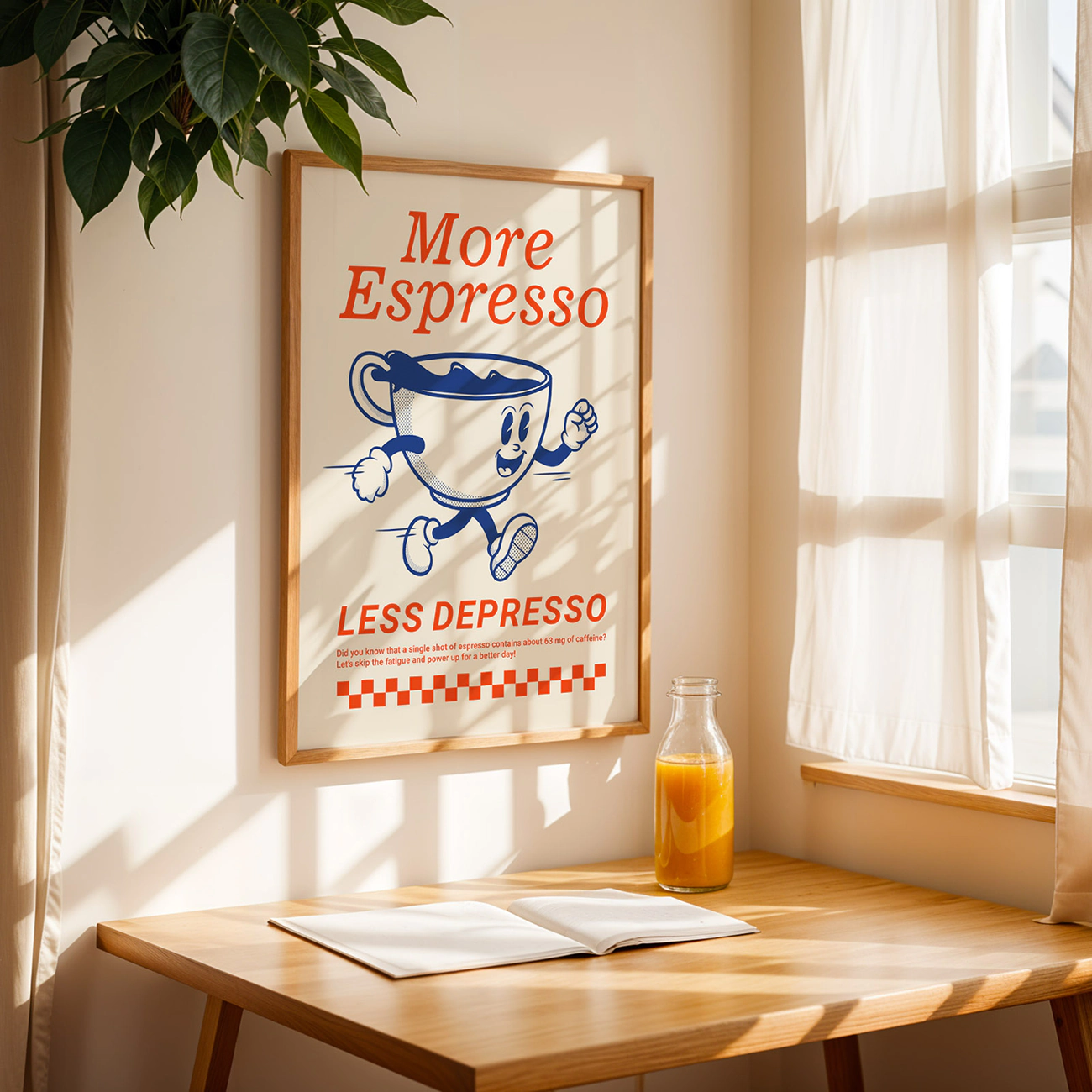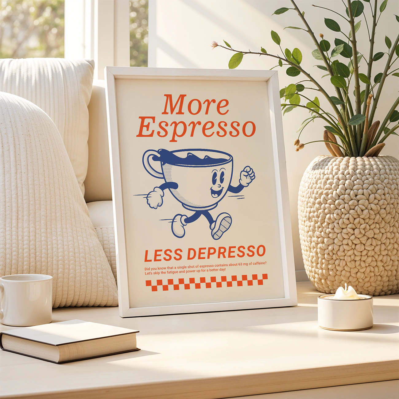 This retro coffee poster is the kind of art that makes your kitchen or coffee nook feel instantly more fun. That cheerful, running coffee cup and the bold “More Espresso, Less Depresso” headline say exactly what every caffeine lover is thinking on a rough morning. The playful vintage colors and clean lines give it all the charm of classic minimalist art prints—simple, punchy, and impossible to ignore. Hang this retro coffee poster where you need a little boost and let it remind you that sometimes, a good cup of coffee is all it takes to turn things around. It’s a daily wink and a smile in poster form.