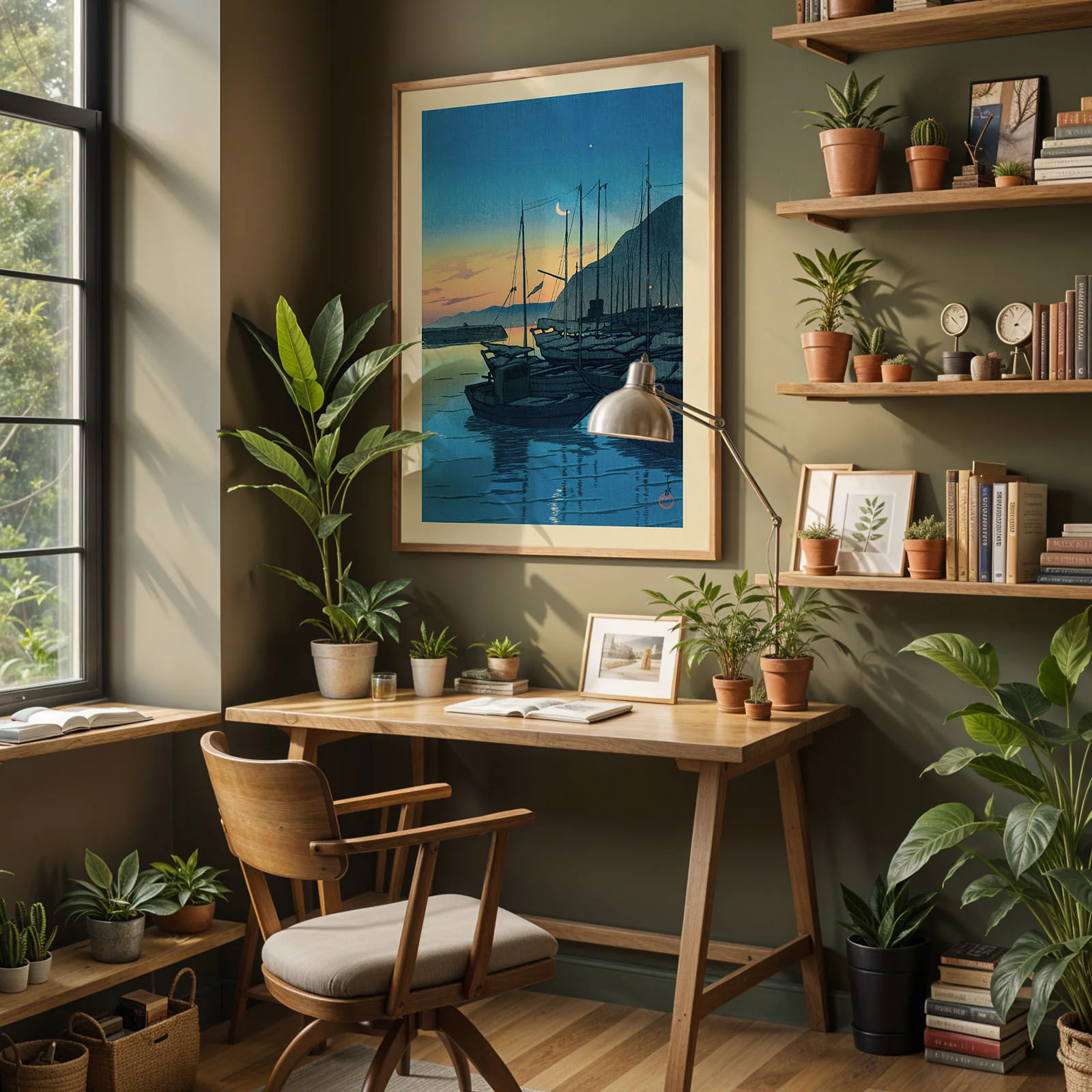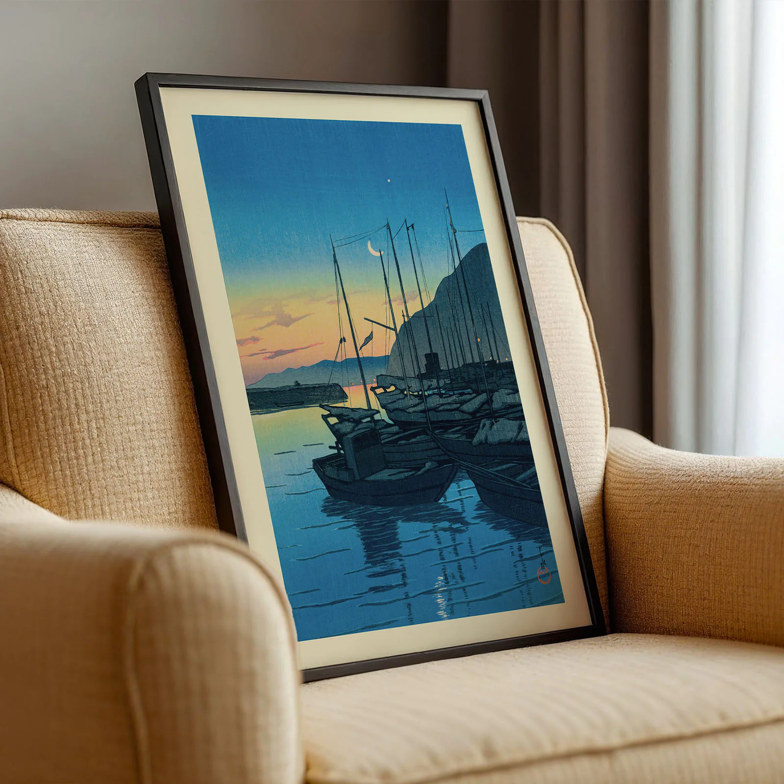 This retro Japanese poster, titled Morning in Beppu, shows a quiet harbor at sunrise with still boats floating on calm water. The sky glows in soft yellow and blue, while a crescent moon and stars still shine above. This is a high-quality reproduction of an original woodblock print by Kawase Hasui, a master of peaceful Japanese landscapes. The soft light and deep shadows create a calm and timeless feeling. Printed on thick, premium paper, this retro Japanese poster will bring beauty and quiet charm to any space.