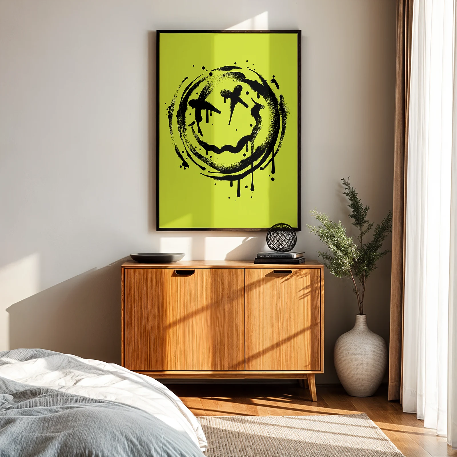 This poster features a large graffiti-style smiley face with dripping paint details. Its bold, simple design immediately catches the eye. The bright background creates strong contrast, making the black graphic stand out clearly. Rough spray-like edges around the face add an urban street-art vibe. Printed on high-quality paper, this smiley face poster suits living rooms, studios, or modern interiors needing a playful wall accent.