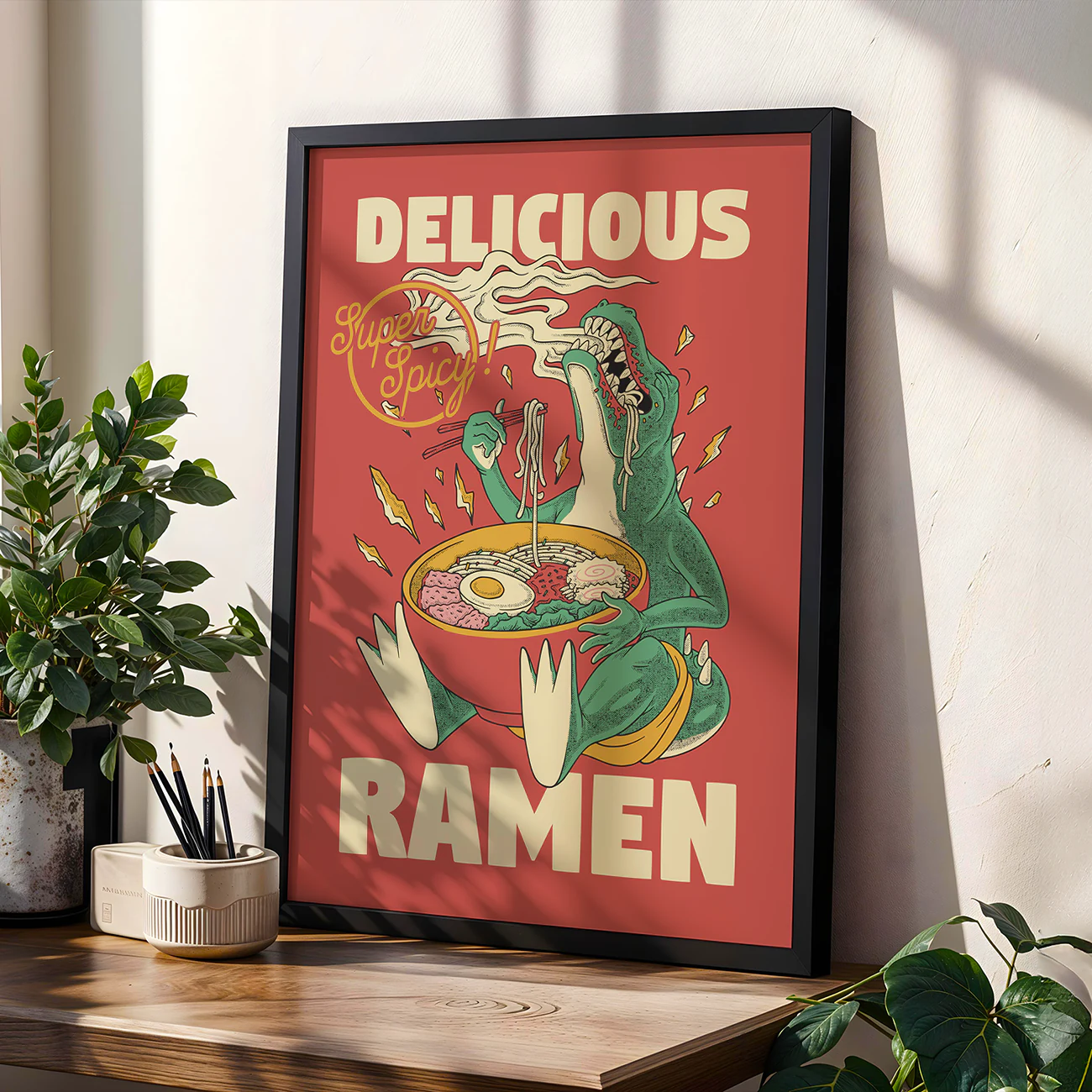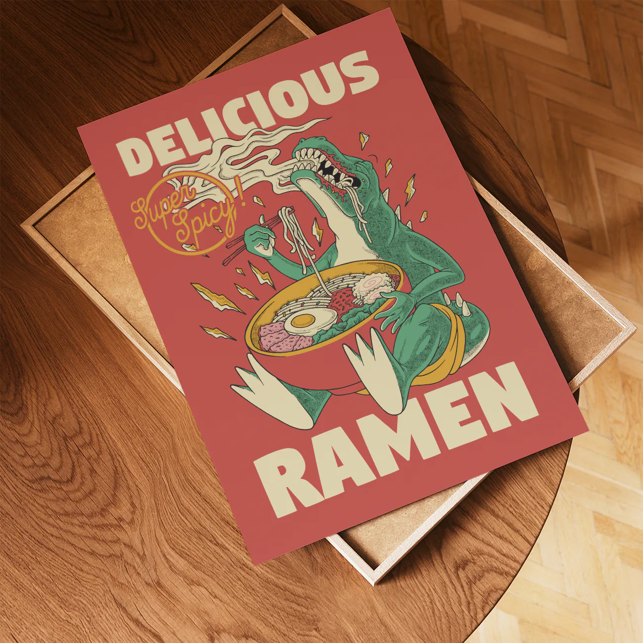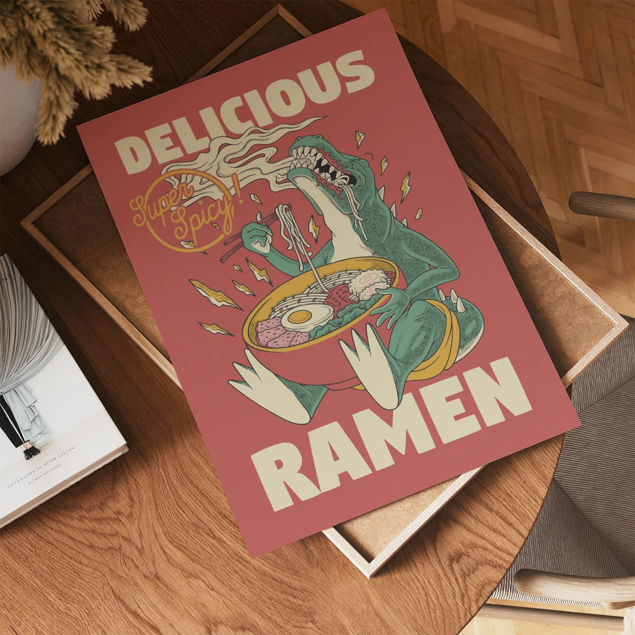 Super Spicy Ramen Print – Retro Dinosaur Poster