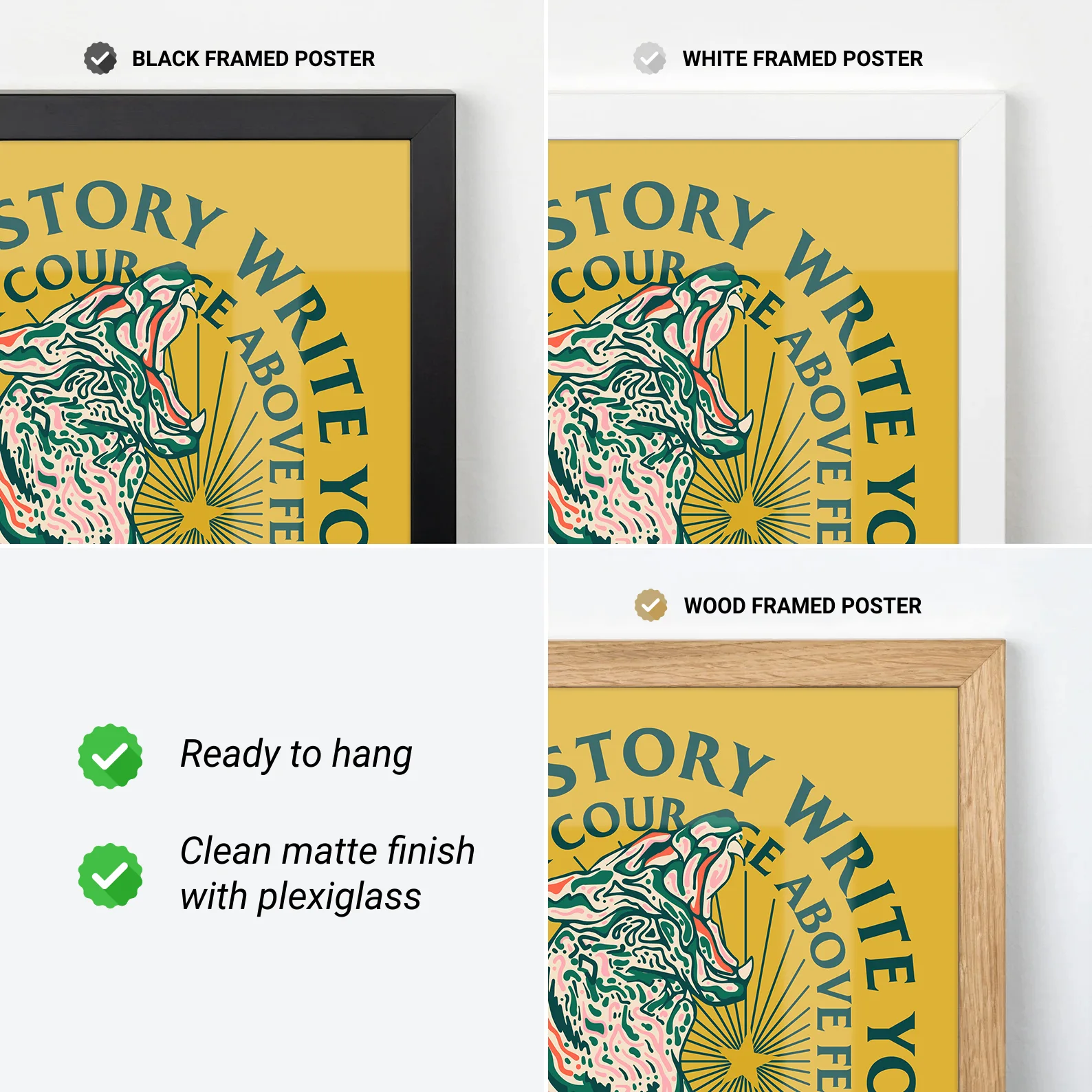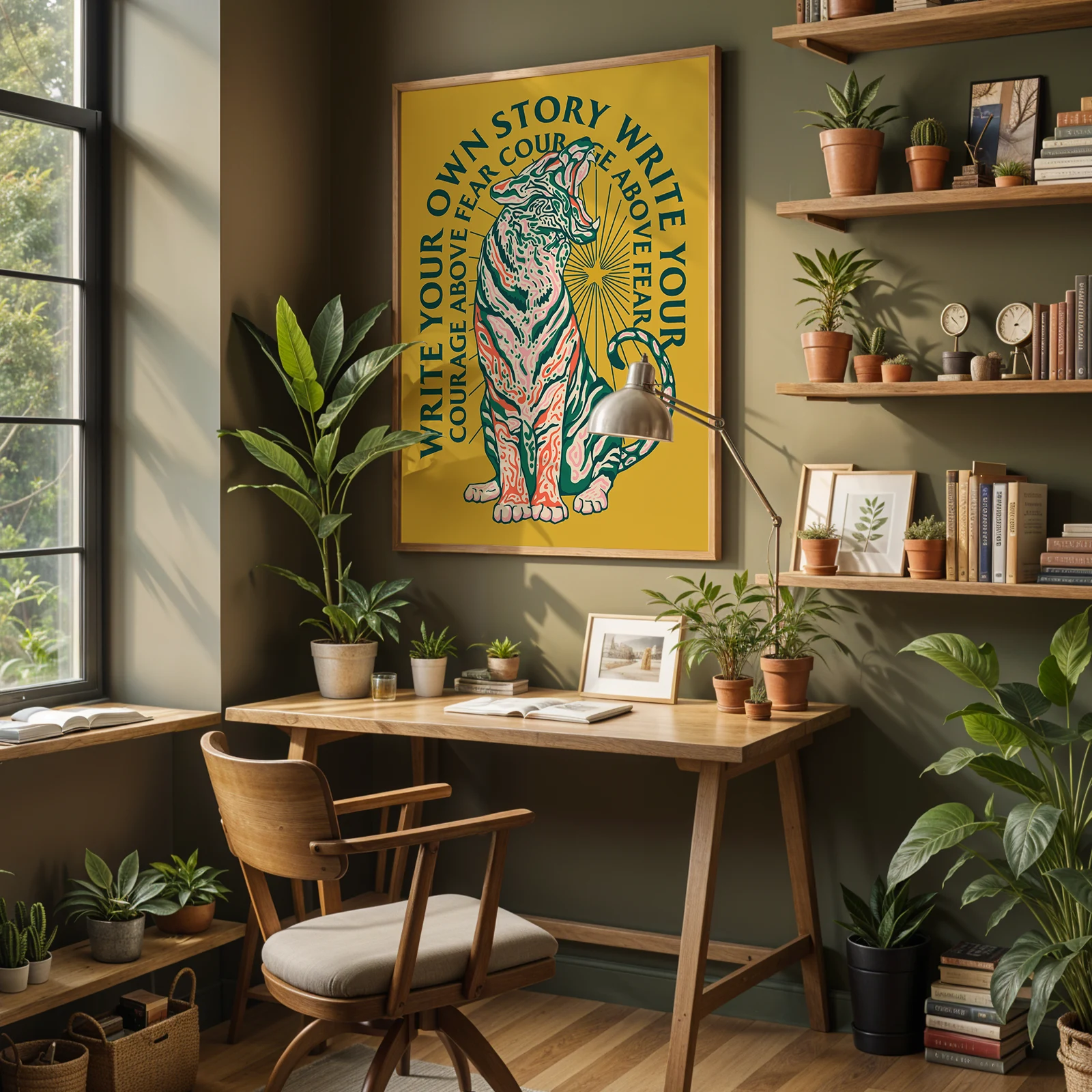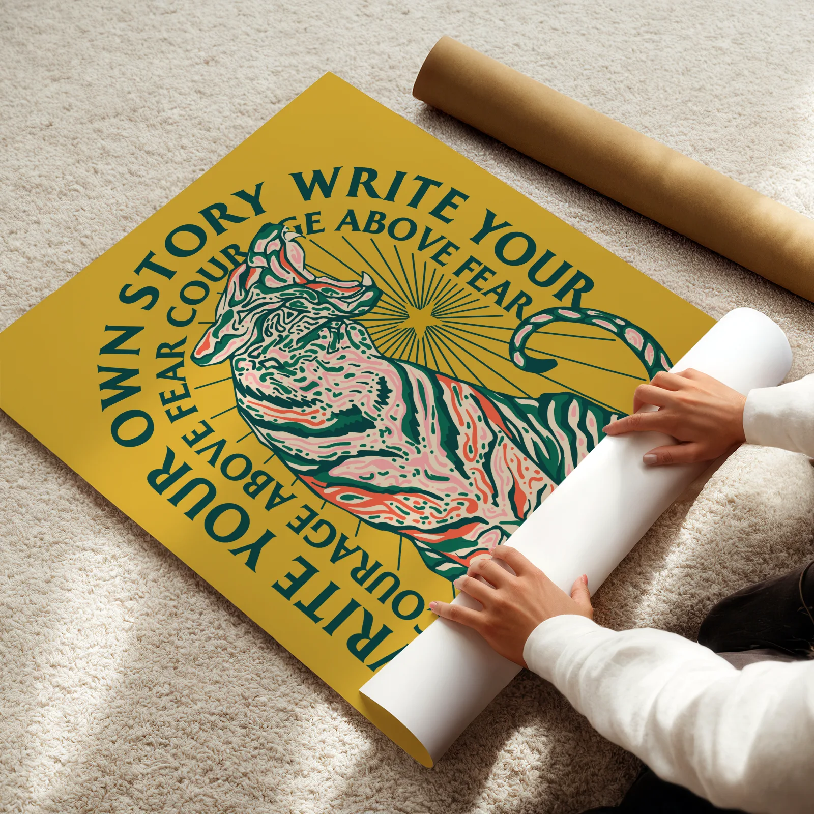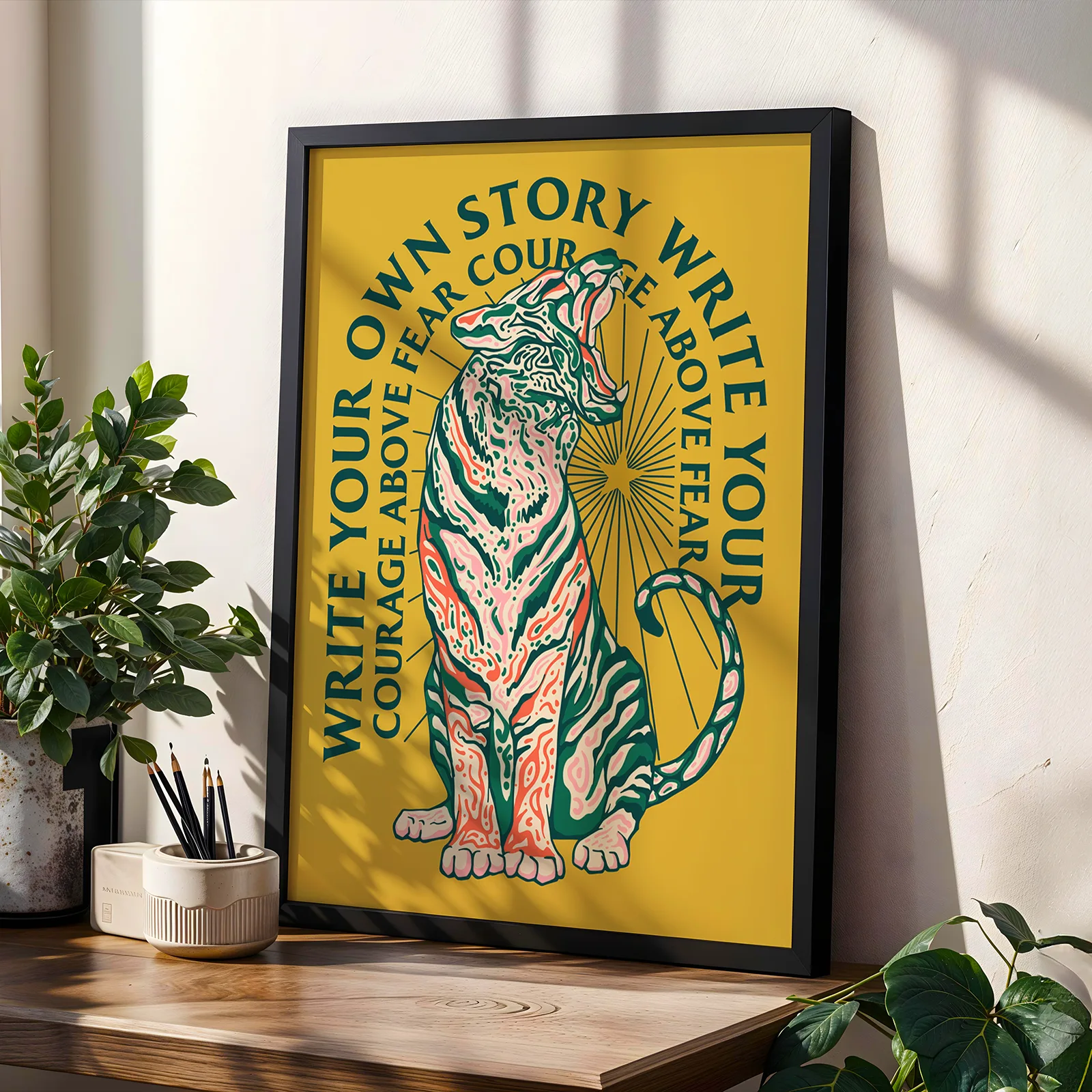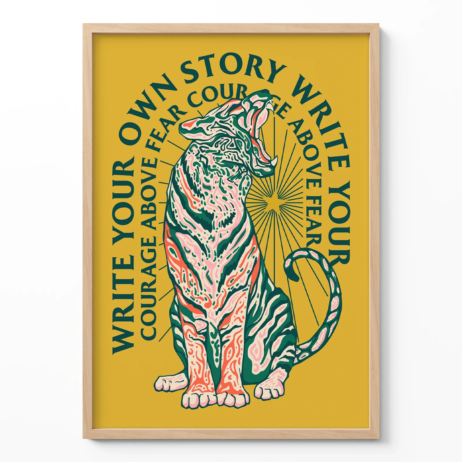 This poster shows a powerful tiger sitting proudly in the center, surrounded by the motivational phrase “Write your own story.” The tiger poster combines bold illustration with strong typography to create an inspiring and expressive design. The warm yellow background and detailed artwork give the poster a vibrant and energetic character. Printed on high quality paper, it works beautifully in living rooms, offices, studios, or creative spaces. For those who enjoy meaningful wall art, the tiger poster brings motivation and strength to any room.