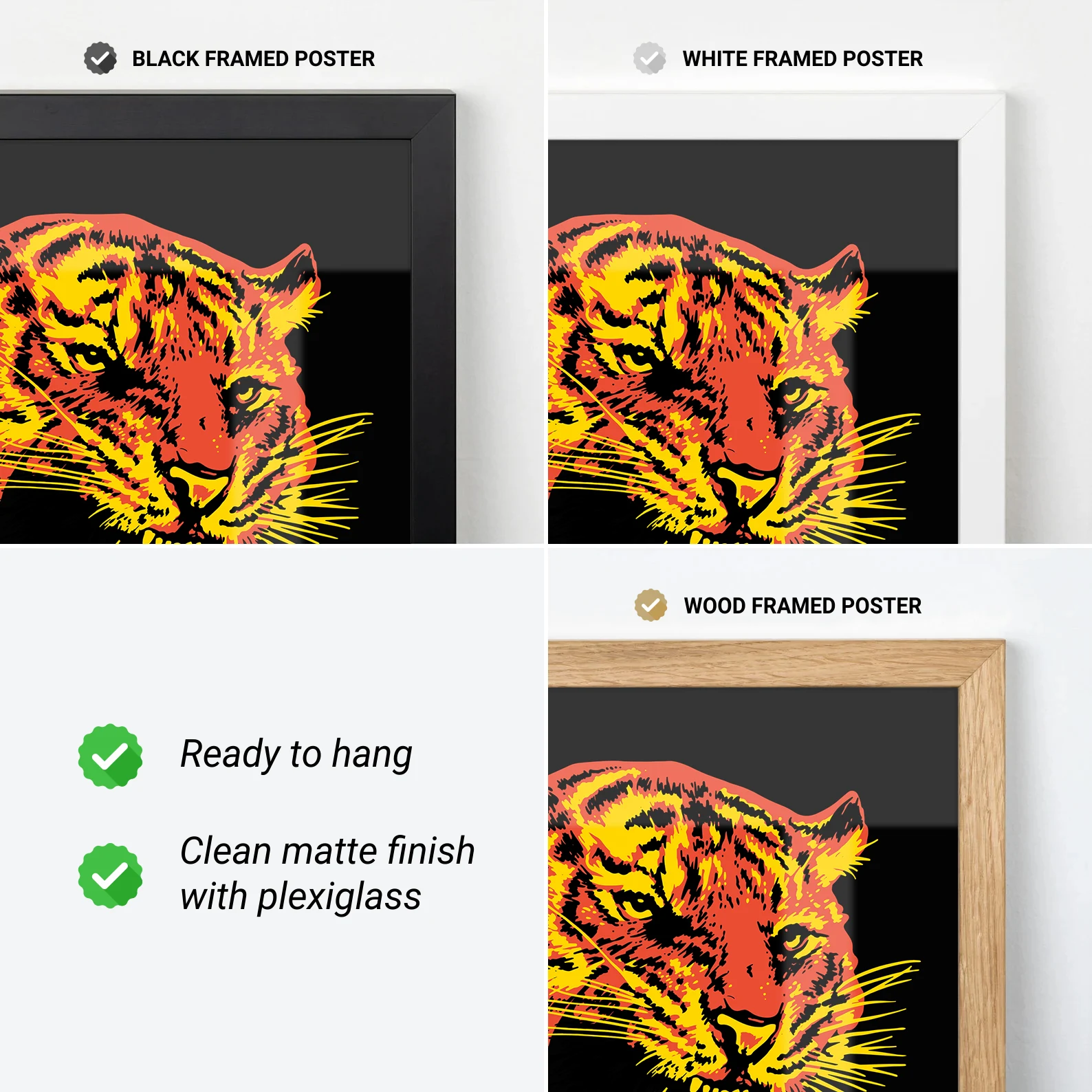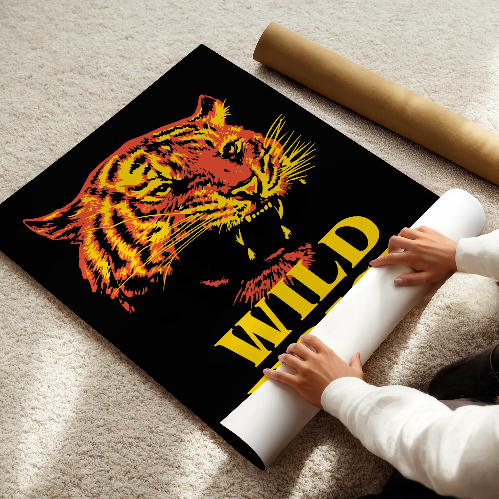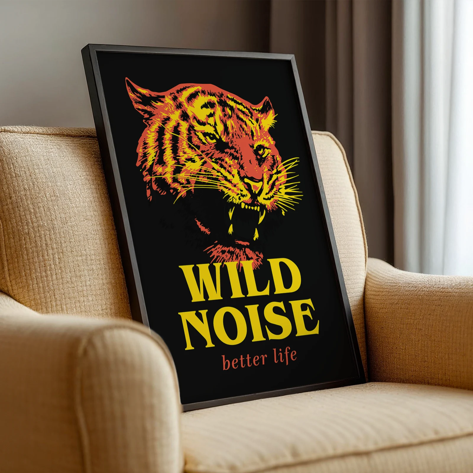 This poster features a roaring tiger above the bold words “Wild Noise”. The tiger poster has a powerful look that instantly draws attention. Bright orange and yellow tones pop against the dark background, making the tiger poster stand out clearly on any wall. The phrase “better life” below adds a concise motivational touch. Printed on high-quality paper, the tiger poster suits living rooms, studios, or modern interiors needing a striking visual accent.