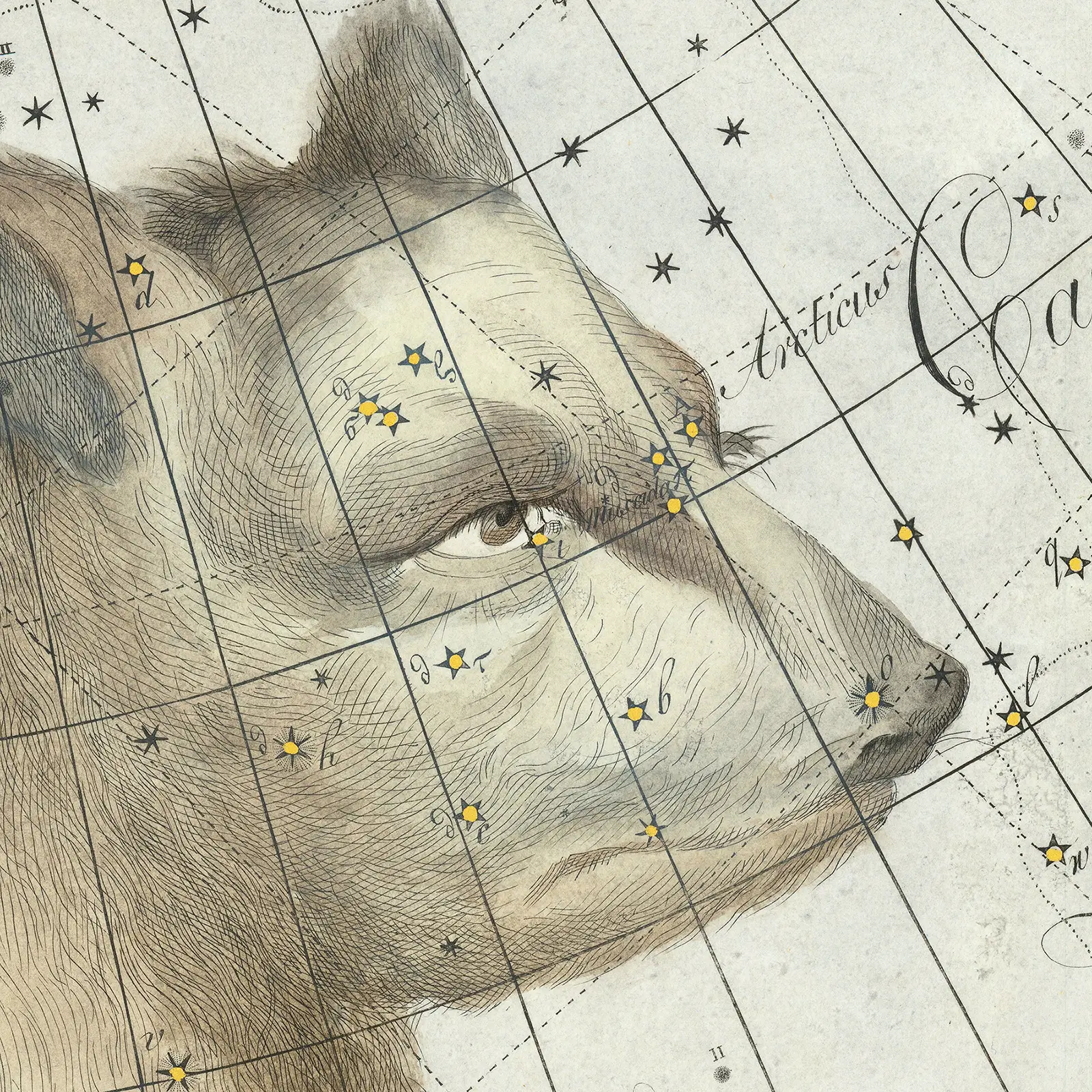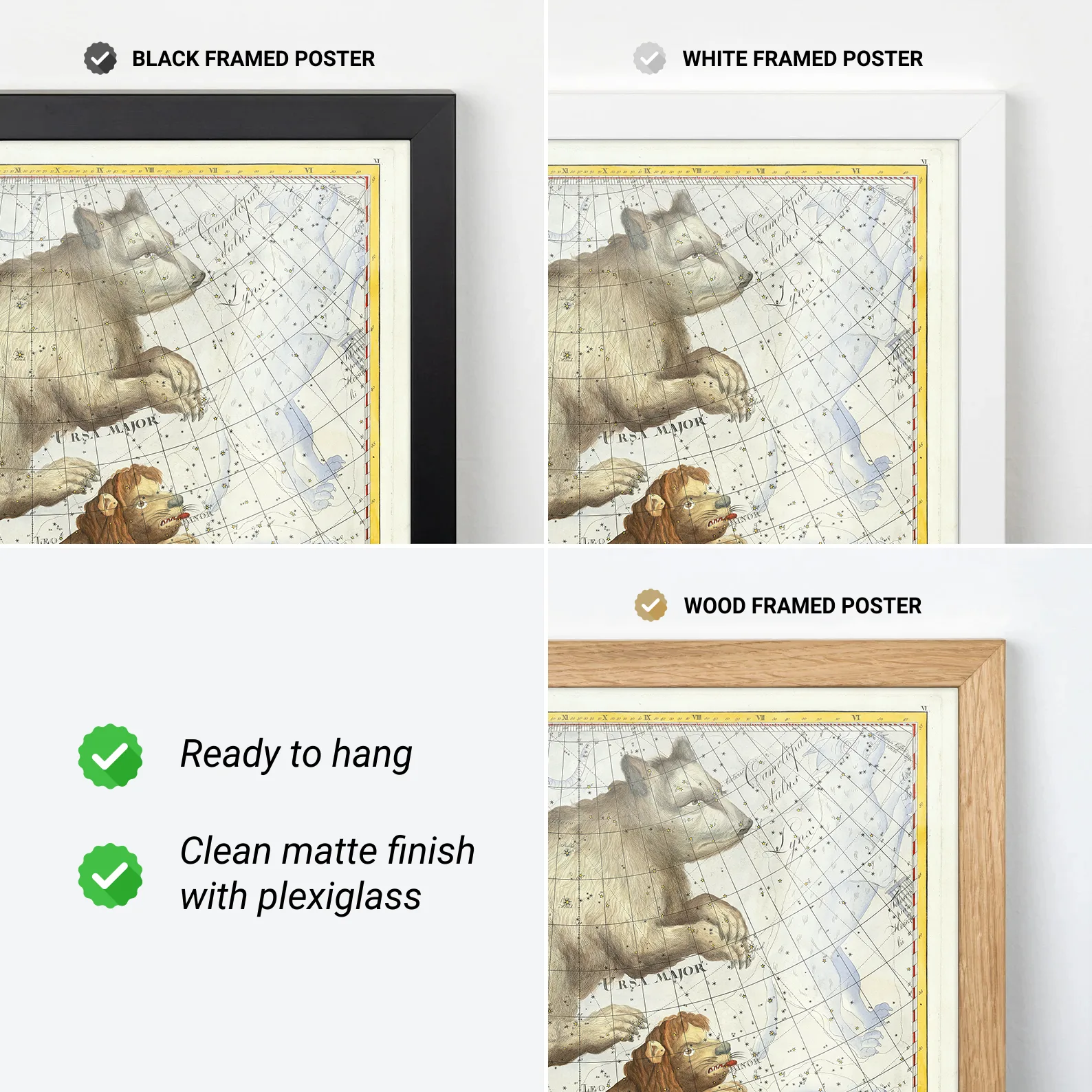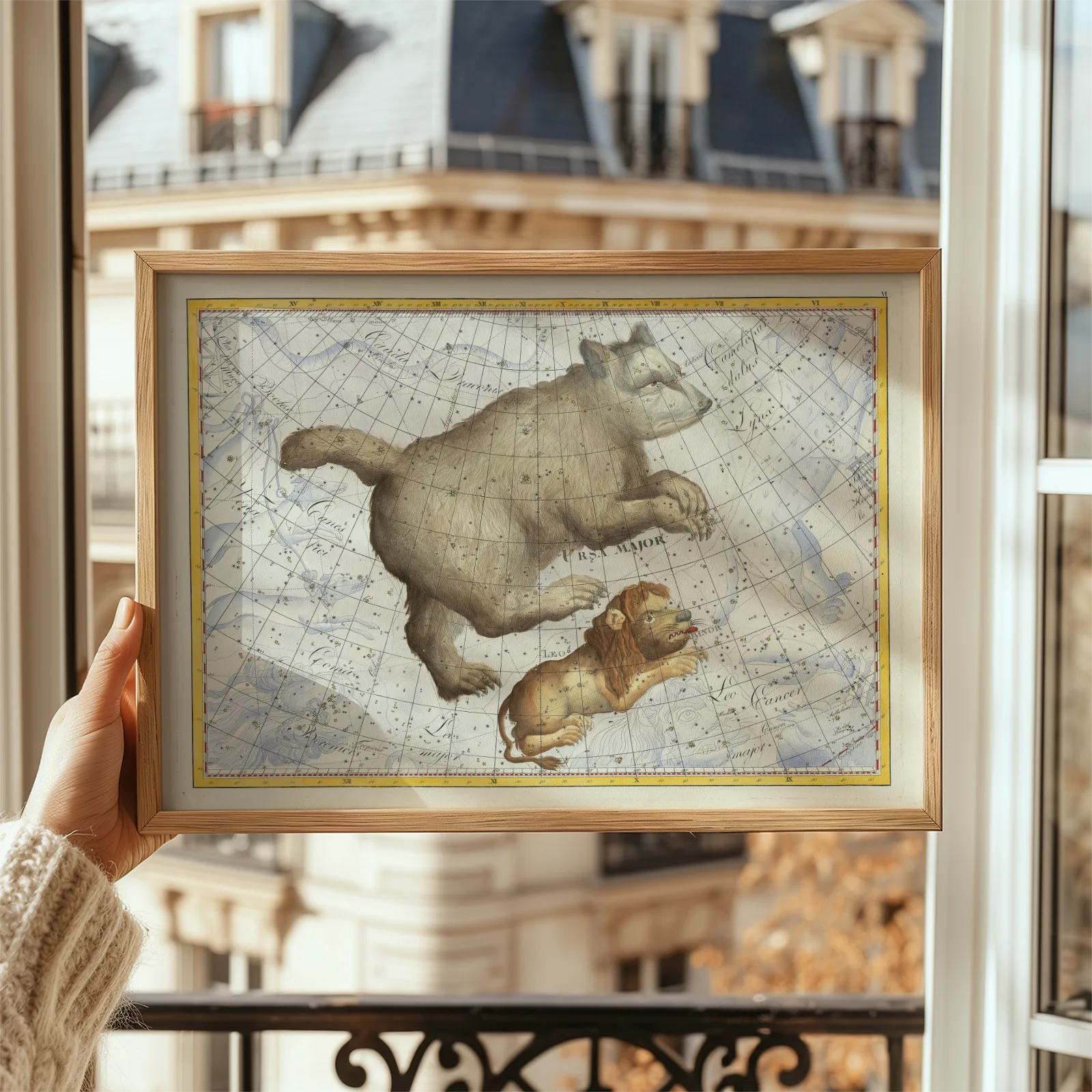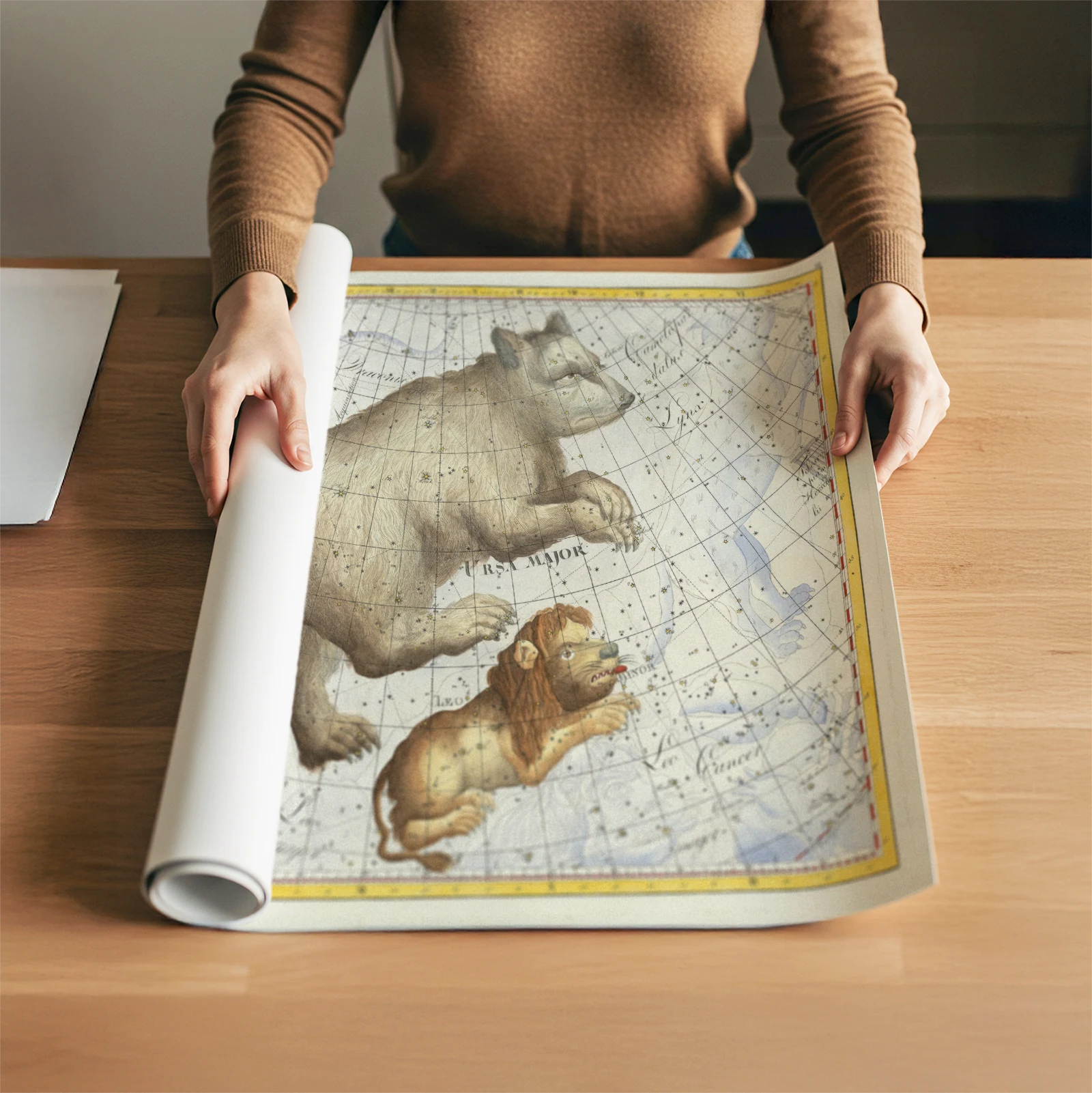 This elegant Ursa Major wall art presents the famous Great Bear constellation in a richly illustrated antique star chart. The early 19th century German artwork reproduction blends astronomy and mythology, showing the powerful bear and nearby Leo woven into a sky filled with delicate stars and fine coordinate lines. Soft aged tones and detailed engraving create depth and historic character. Perfect for a study, office, or living room, this Ursa Major wall art is printed on high quality paper and brings timeless celestial beauty into your interior.