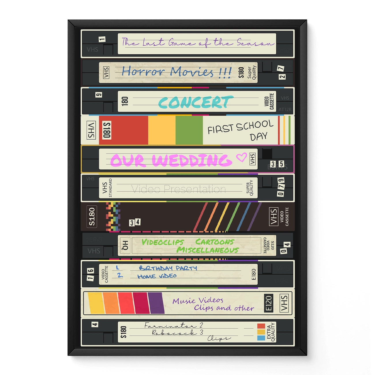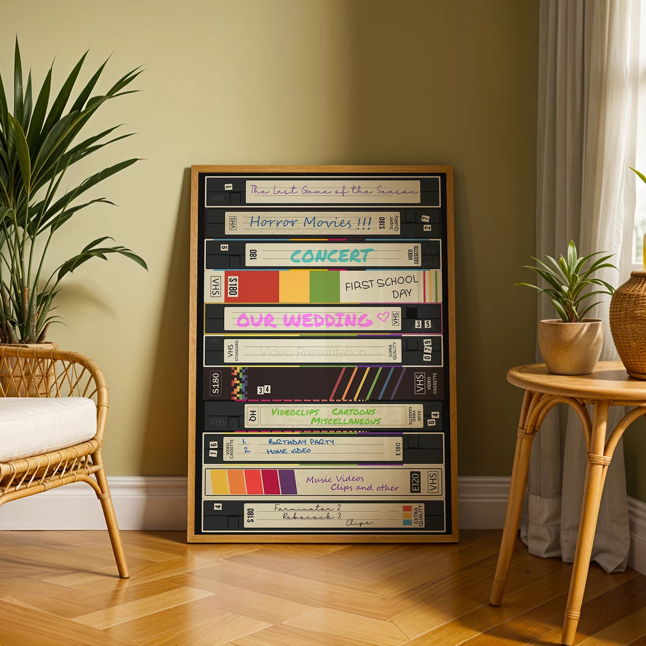 This VHS wall art brings all the 80s and 90s nostalgia straight to your wall. Featuring a vibrant stack of labeled VHS tapes—from horror movies to birthday parties—it’s a fun nod to the good old analog days. Perfect for adding a retro vibe to your living room, home office, or media space. Printed on premium matte paper, the poster delivers both style and quality. Whether you’re a vintage video collector or just love the aesthetic, this VHS wall art will rewind you right back in time.