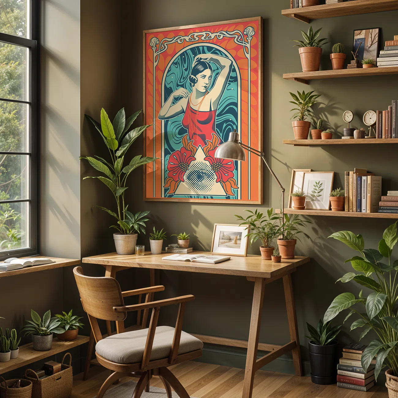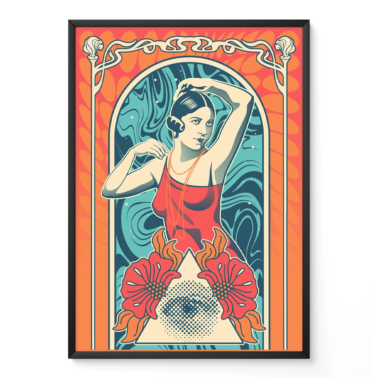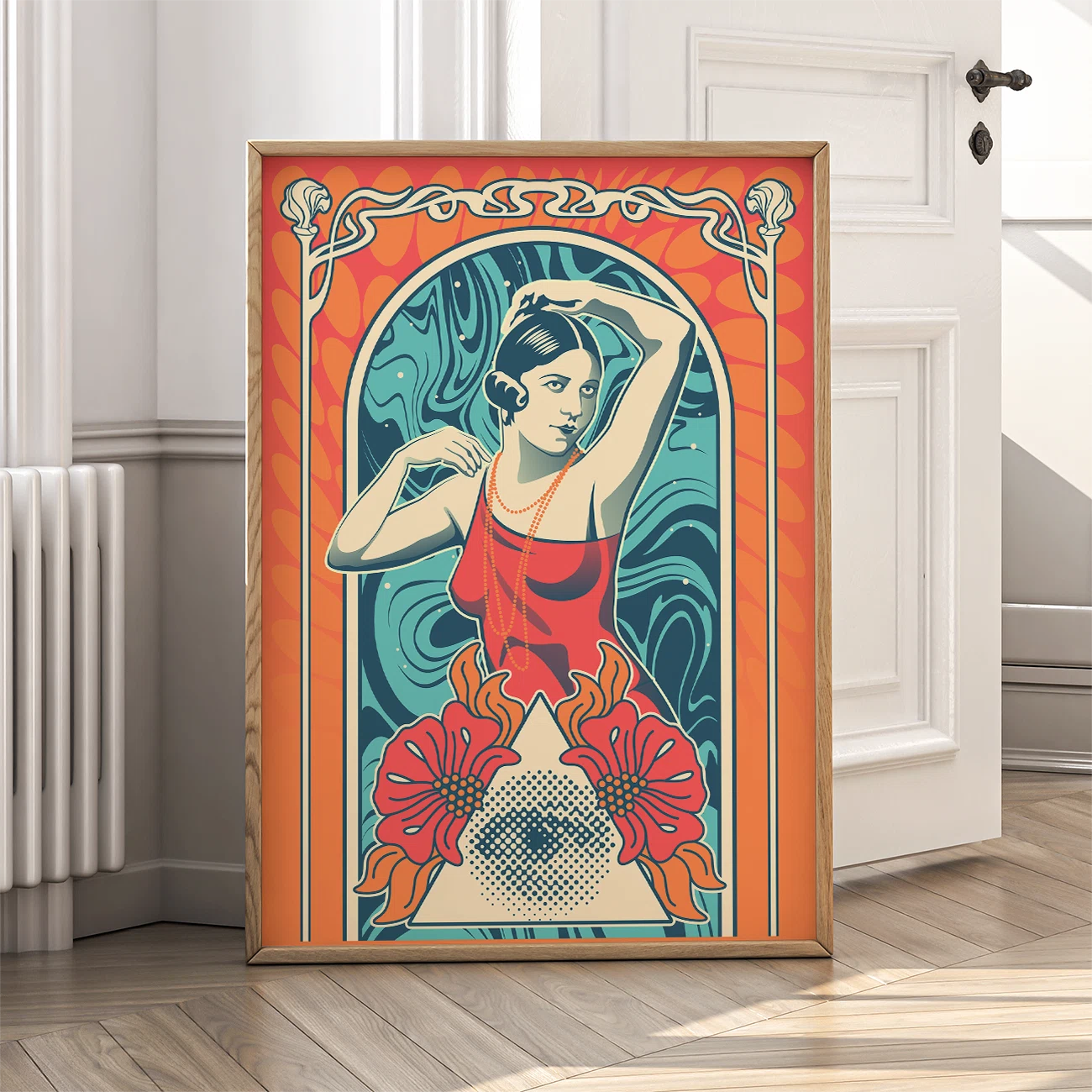 This bold and colorful poster is a stunning example of vintage art of women. It features an elegant lady in a classic art nouveau style, surrounded by detailed floral design and flowing shapes. The warm retro colors and stylized look make it a perfect piece for vintage lovers. Whether for a gallery wall or as a standout artwork, this vintage art of women print brings timeless beauty and artistic flair to any interior.