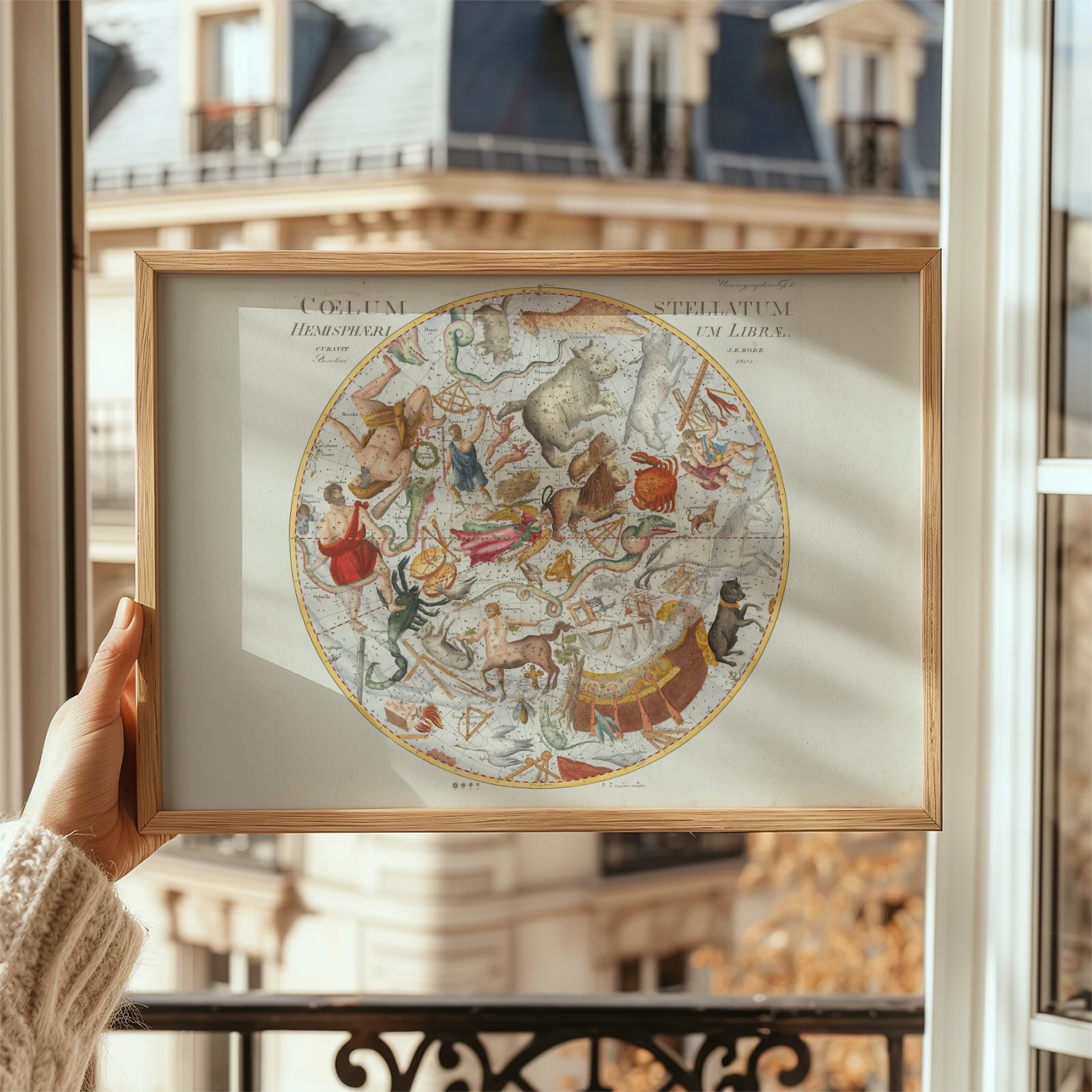 This impressive celestial map poster showcases a beautifully detailed antique star chart filled with mythological constellations and astronomical symbols. The early 19th century German artwork reproduction, created by a renowned astronomer and mathematician, blends science and art in a harmonious circular composition. Fine lines, soft aged tones, and intricate figures invite you to explore the night sky from centuries past. Perfect for a study, office, or living room, this celestial map poster is printed on high quality paper and brings intellectual charm and vintage elegance to your space.