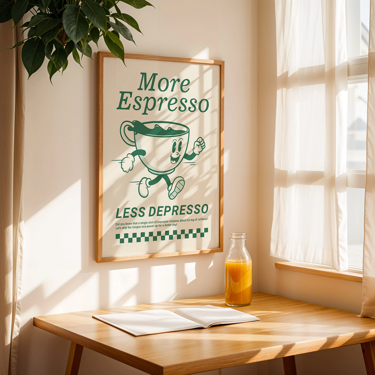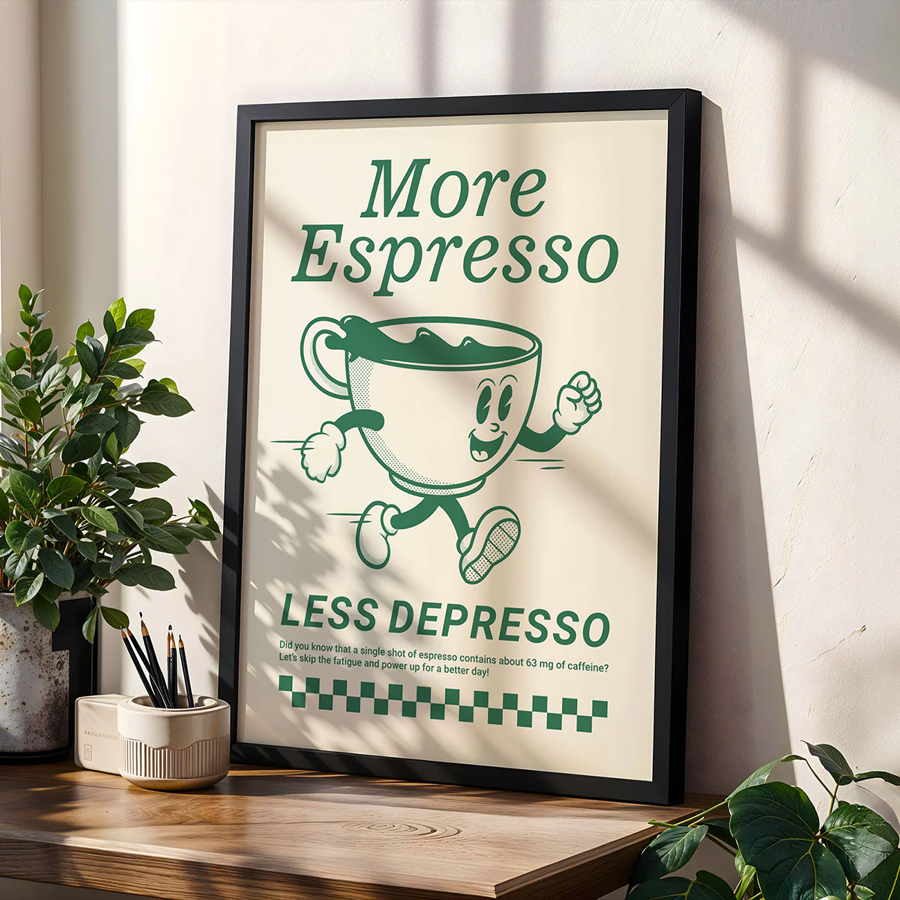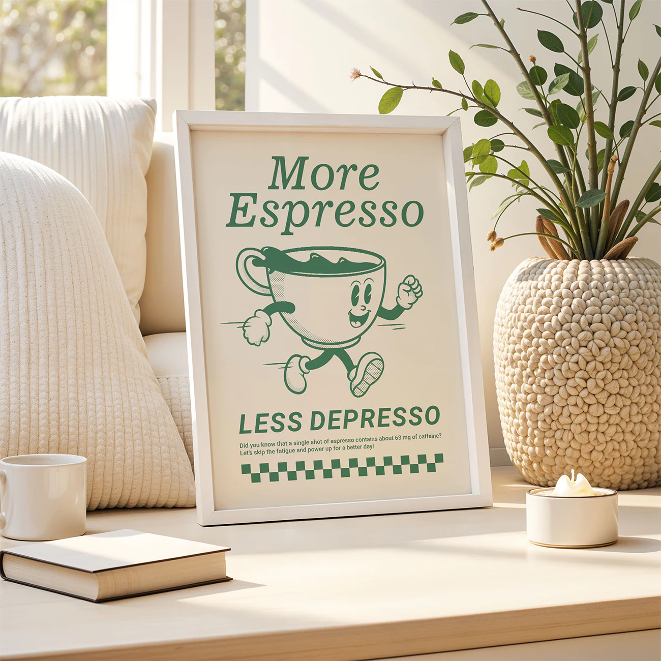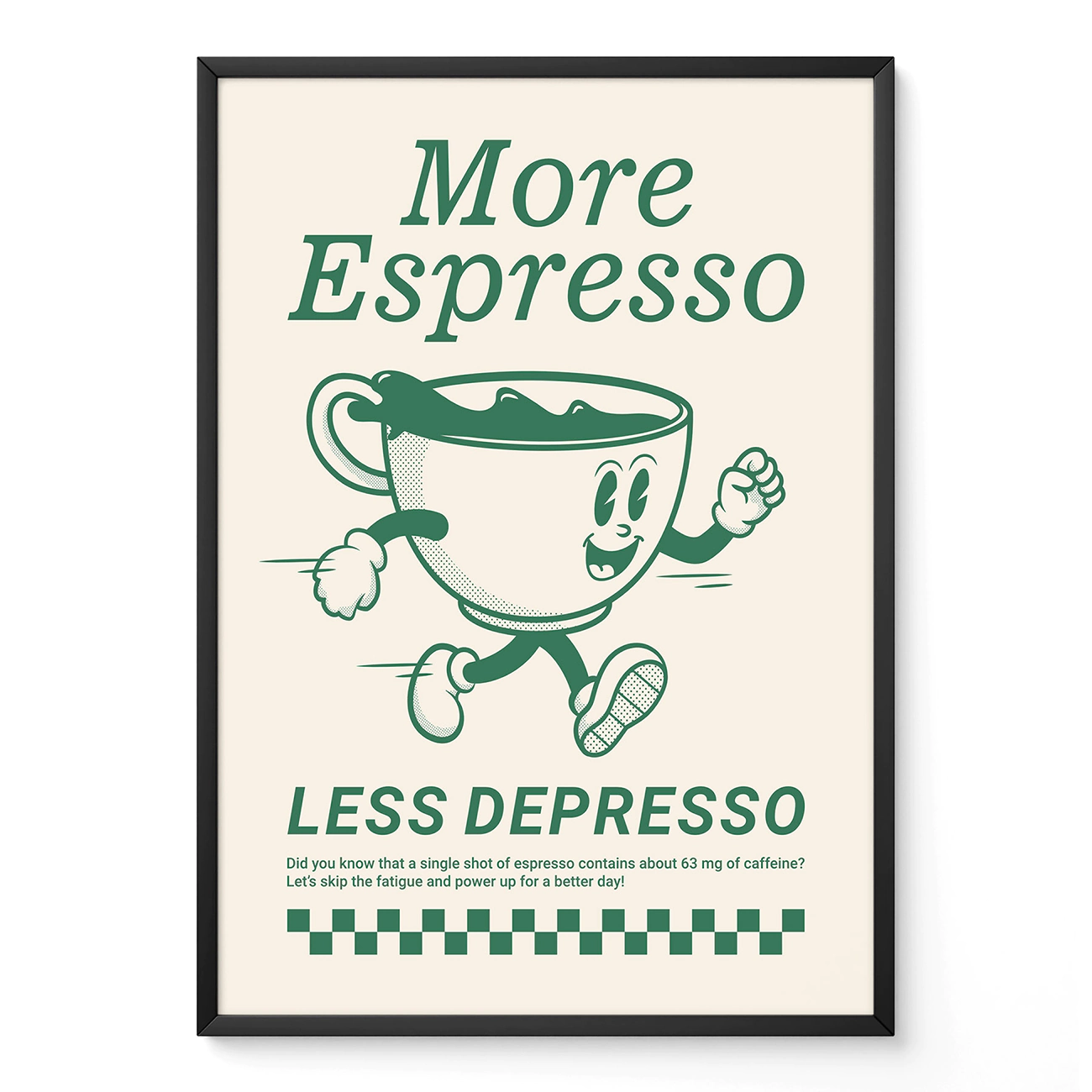 This vintage coffee poster is a real mood-booster for any coffee lover’s space. The playful, running coffee cup and big “More Espresso, Less Depresso” headline instantly set the tone for brighter mornings. There’s something about the bold green on cream, paired with that classic checkerboard detail, that nails the charm of true retro posters while keeping things clean and fresh—just like the best minimalist art prints. Hang this up in your kitchen, office, or coffee nook, and let it remind you that a good shot of espresso (and a little humor) is sometimes all you need to turn the day around. This vintage coffee poster is all about simple joy and daily pick-me-ups.