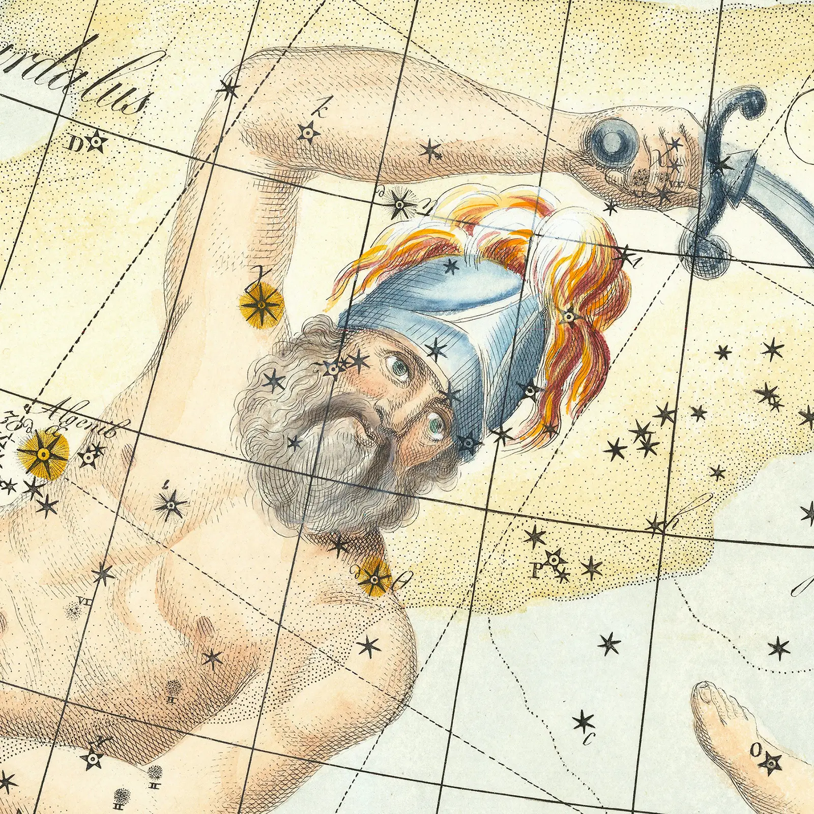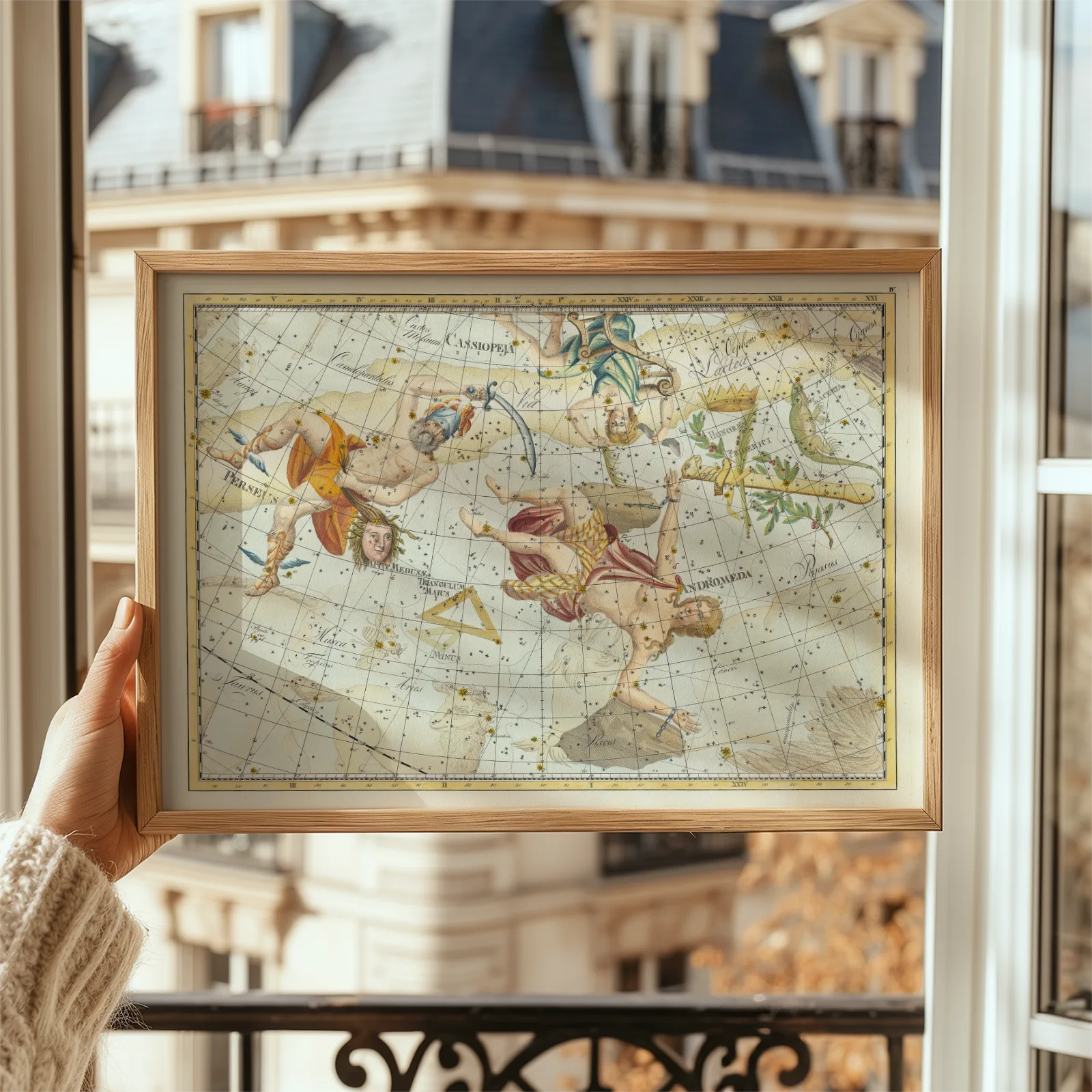 This beautifully detailed vintage constellation map blends astronomy and mythology in an elegant celestial composition. The early 19th century German artwork reproduction, created by a renowned astronomer and mathematician, presents classical figures woven among carefully charted stars and delicate coordinate lines. Soft aged tones and intricate engravings give the piece both scientific depth and artistic refinement. Ideal for a study, office, or living room, this vintage constellation map is printed on high quality paper and brings historic charm and intellectual character to your interior.