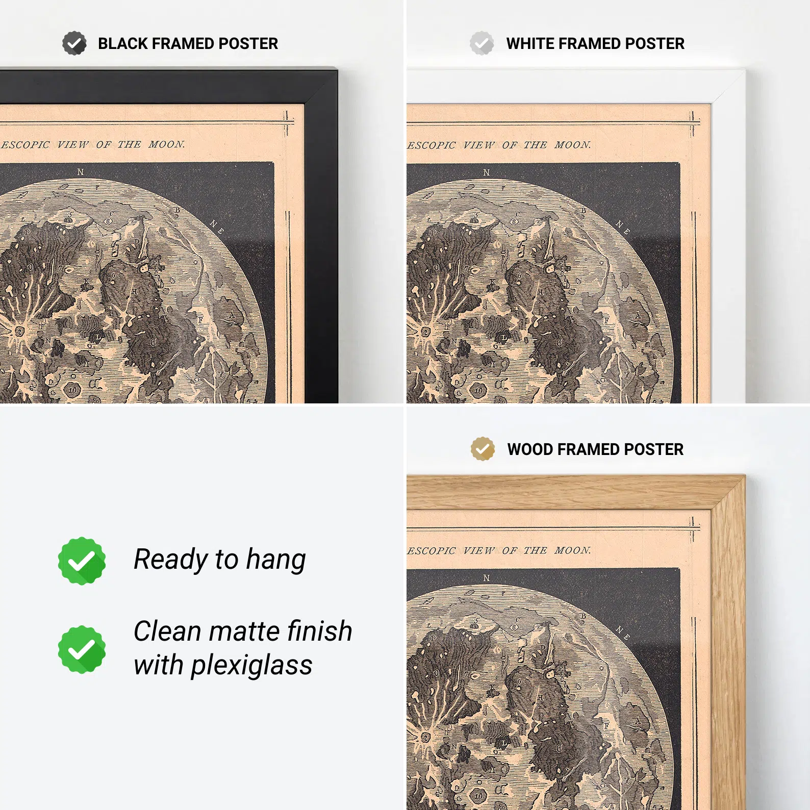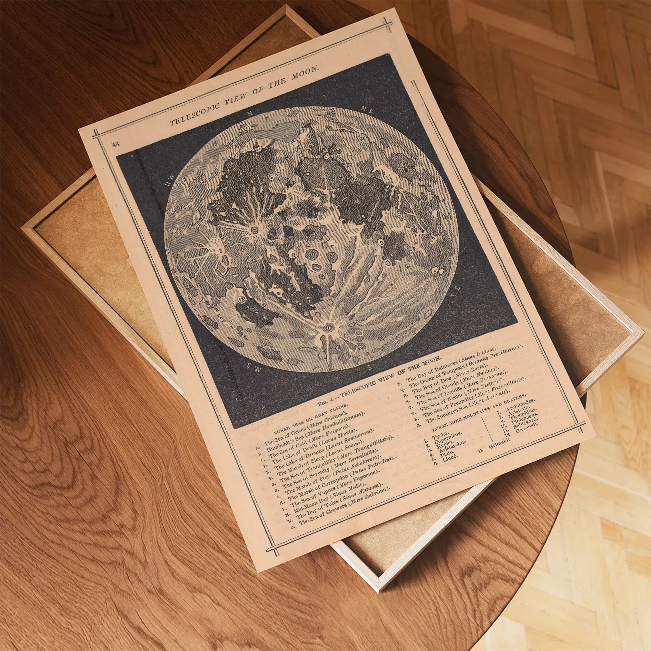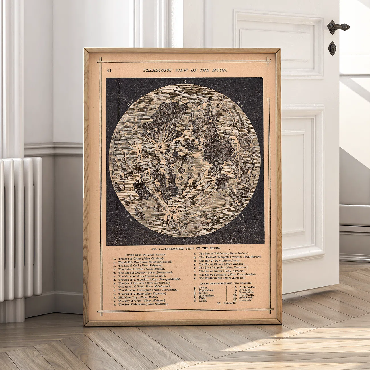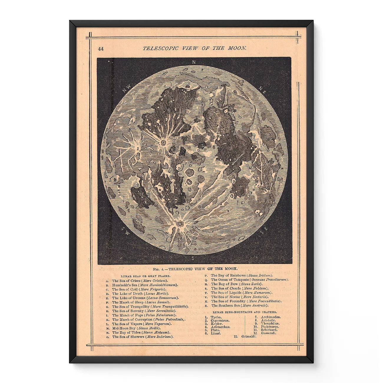 This vintage moon map poster brings space exploration into your home with classic style. The detailed telescopic view showcases lunar seas and craters, making it a great piece for astronomy fans or anyone who loves vintage design. The aged paper tone and scientific labeling add charm and character to any wall – from a cozy study to a modern living room. Printed on thick matte paper, the poster offers crisp lines and a timeless look. Whether you’re decorating a science-themed space or gifting a stargazer, this vintage moon map is a perfect choice.