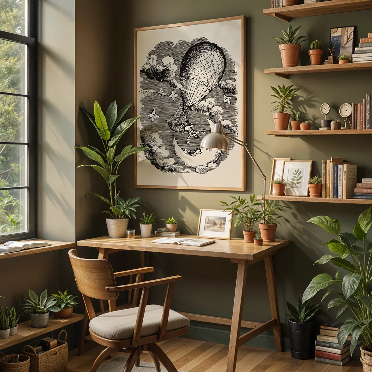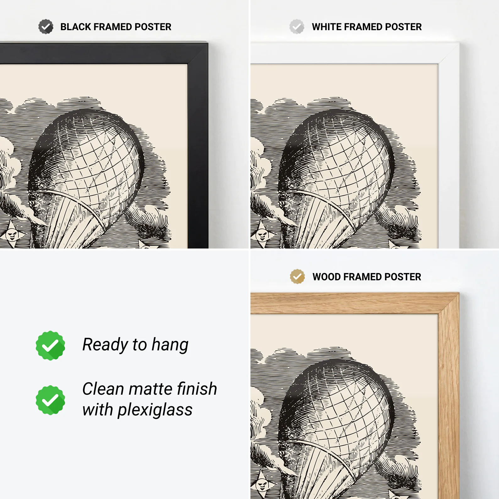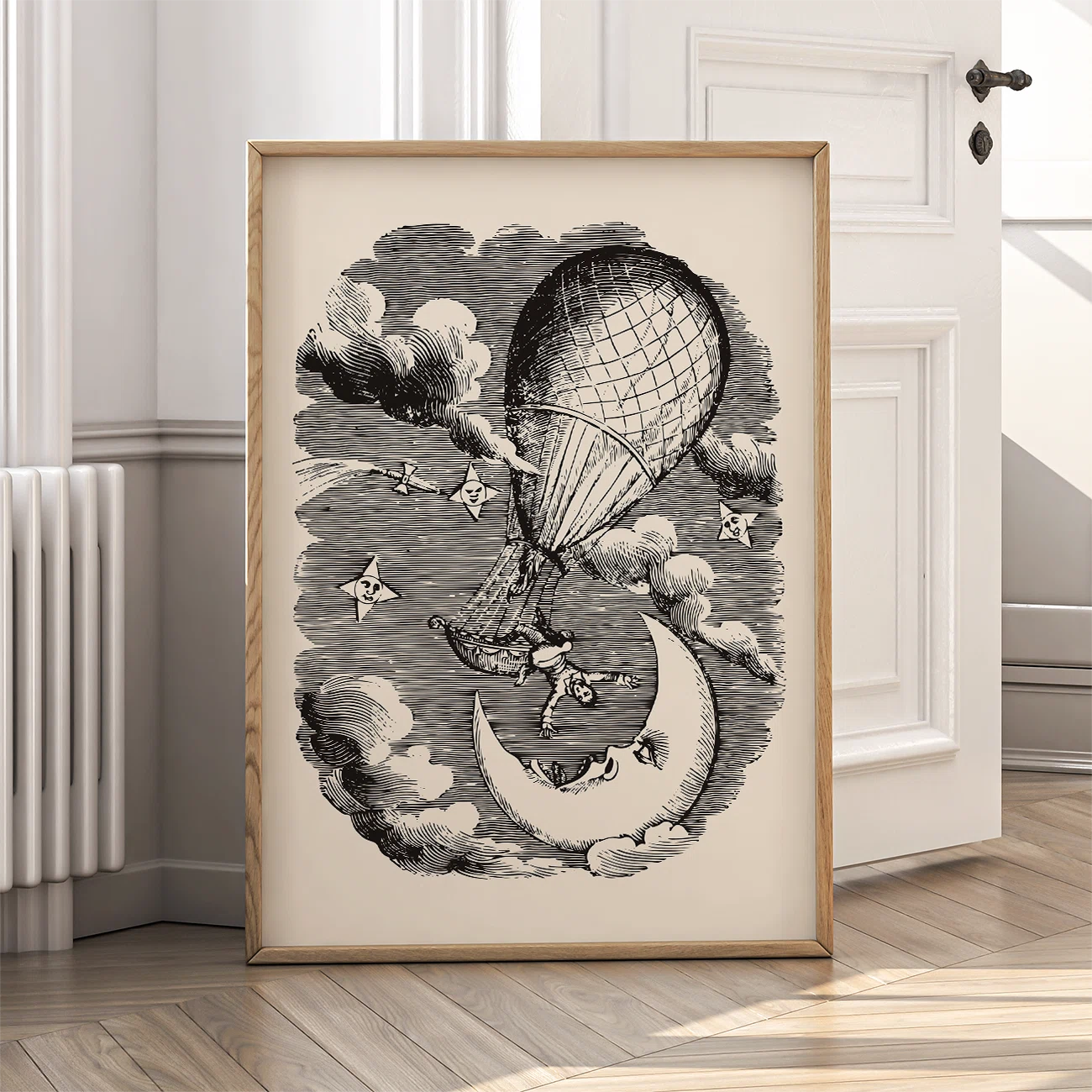 This vintage moon poster takes you into a dreamlike sky filled with clouds, stars, and a hot air balloon adventure. The artwork, drawn in a bold black ink style, shows a whimsical scene where a man dangles toward a moon with a face. It’s perfect for vintage lovers, astronomy fans, or anyone who enjoys surreal art. The print is produced on matte paper, offering both quality and charm. If you’re looking for a magical and mysterious vintage moon poster, this one brings imagination to life.