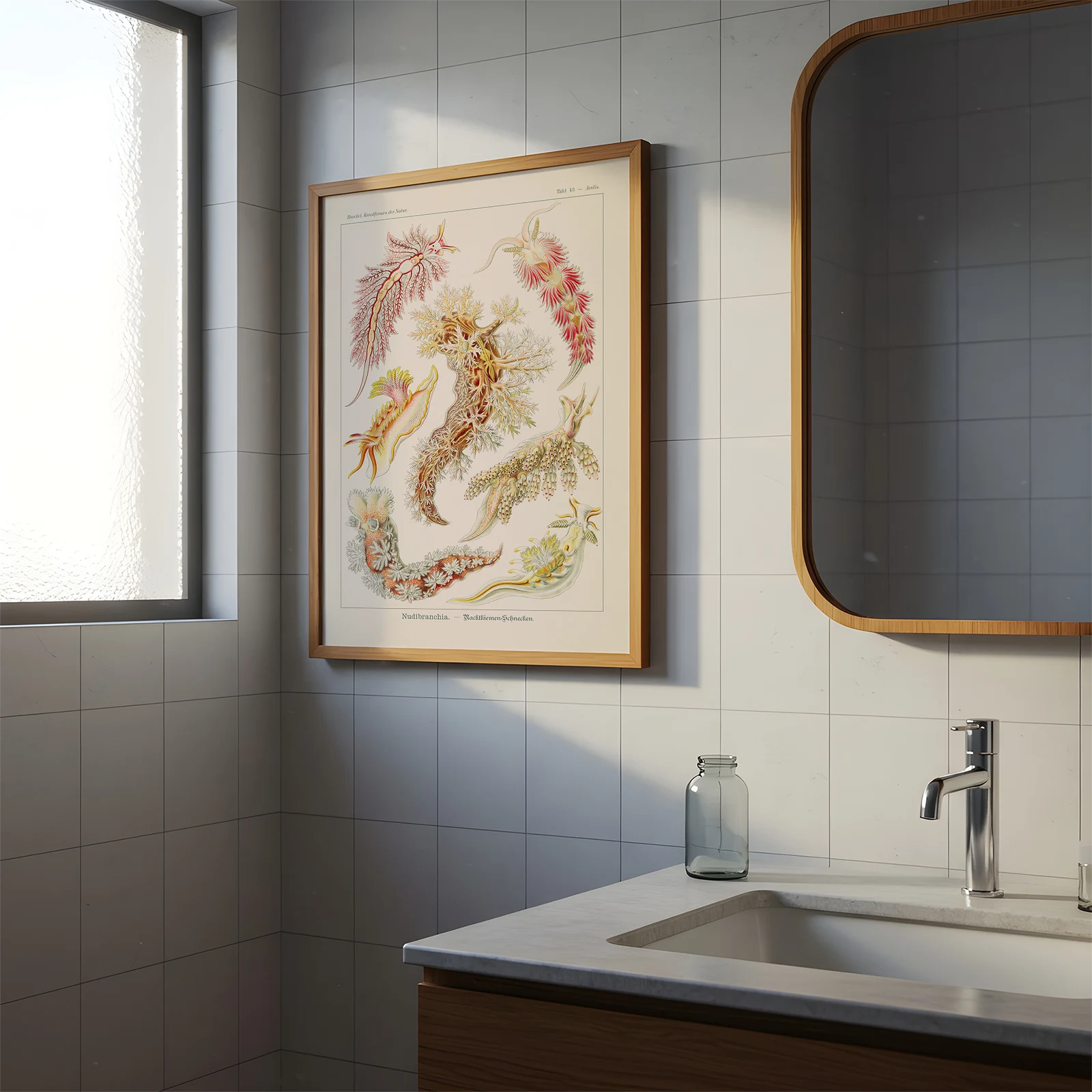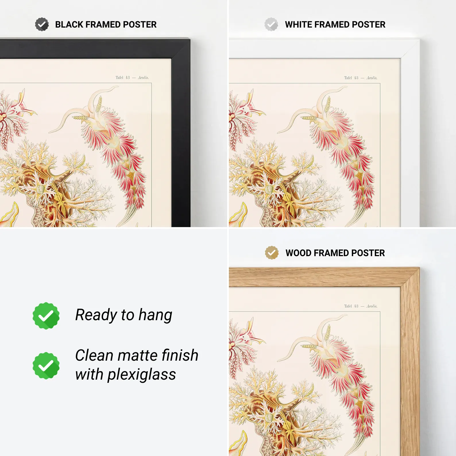 This vintage ocean poster by Ernst Haeckel showcases the beauty of nudibranchs—vivid sea slugs with fantastical shapes and flowing forms. Originally illustrated for his Art Forms of Nature, this piece combines natural science and elegant design in one mesmerizing view. The pastel tones and graceful details make it ideal for bathrooms, creative workspaces, or ocean-themed interiors. Printed on high-quality paper, it highlights every fine line and organic texture. Let this vintage ocean poster bring a soft, surreal marine touch to your wall.