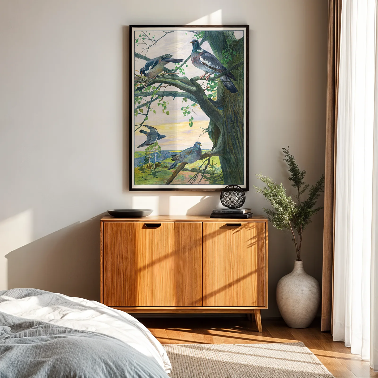 This beautiful pigeon poster captures a peaceful moment in nature with fine vintage detail and soft natural colors. The early 20th century German artwork reproduction shows pigeons resting in a tree, surrounded by gentle evening light and a quiet landscape in the distance. The balanced composition brings a calm feeling to any room, making it perfect for a living room, hallway, or study. Printed on high quality paper, this pigeon poster adds timeless charm and warmth to your interior.