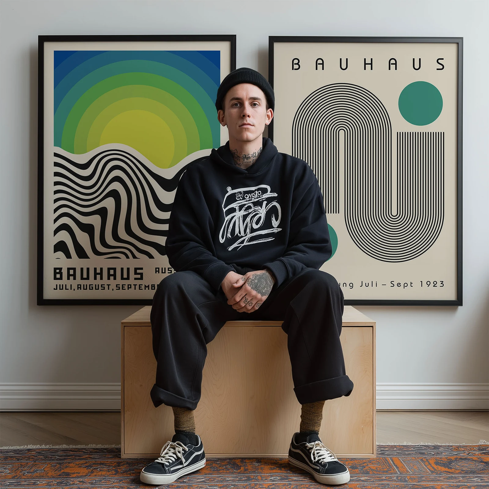 These wall posters for bedroom combine calming colors and iconic Bauhaus geometry to create a relaxing yet modern visual appeal. One print showcases flowing black waves under a radiant gradient sun, while the other features hypnotic curves and green accents. Ideal for bedrooms, reading nooks, or peaceful workspaces, this set balances structure and serenity. Printed on high-quality paper, both posters offer long-lasting clarity. With timeless style, these wall posters for bedroom will bring harmony and character to your personal space.