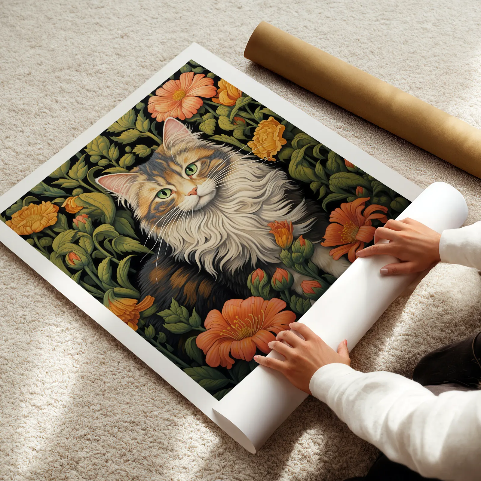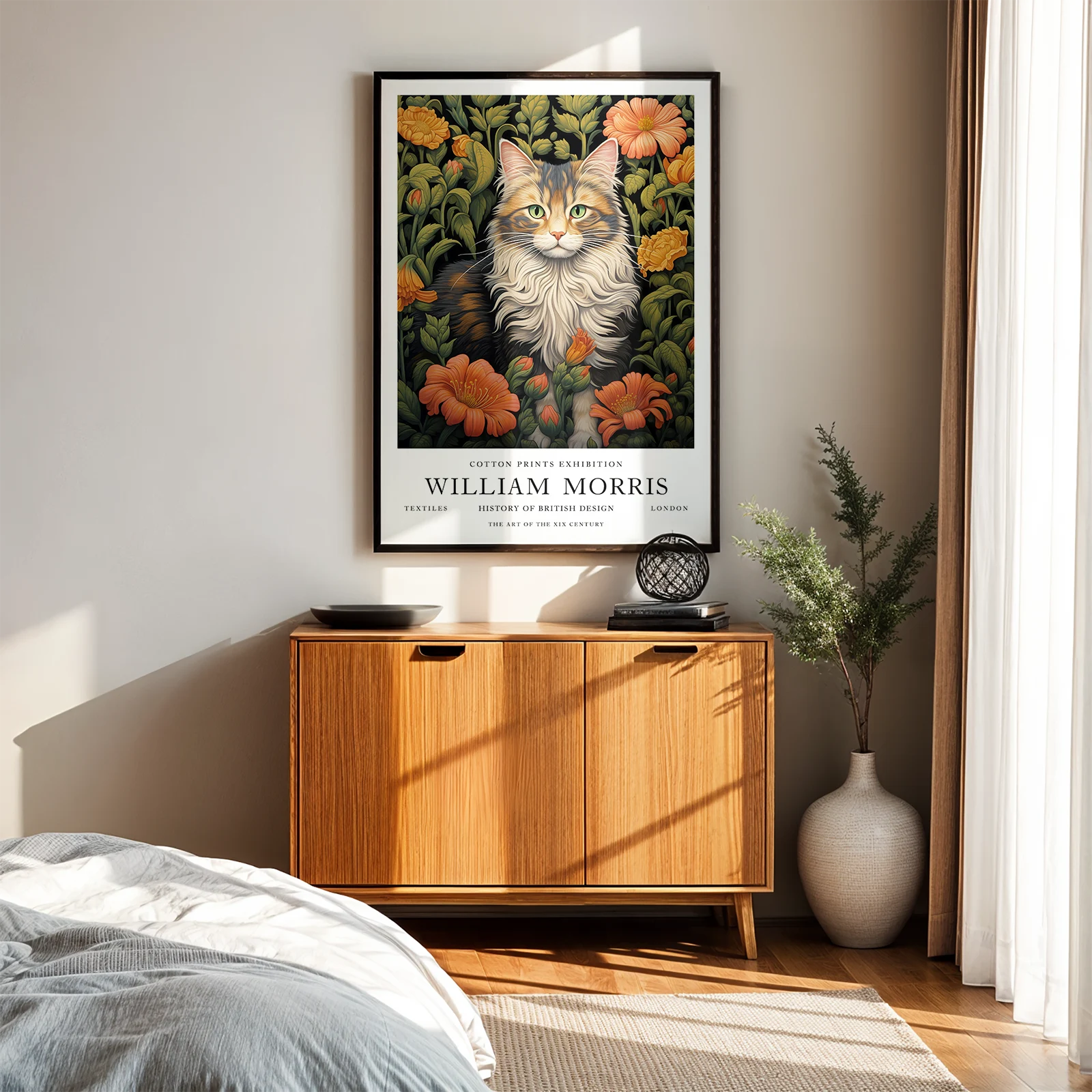 This cat art print is inspired by the decorative style of William Morris and blends elegance with natural beauty. The detailed fur and expressive green eyes stand out against the rich background of orange blossoms and deep green leaves. Flowing lines and layered botanical elements create balance and depth, giving the artwork a timeless character. This cat art print is perfect for a living room, bedroom, or cozy reading corner, adding warmth, charm, and a refined vintage atmosphere to your interior.