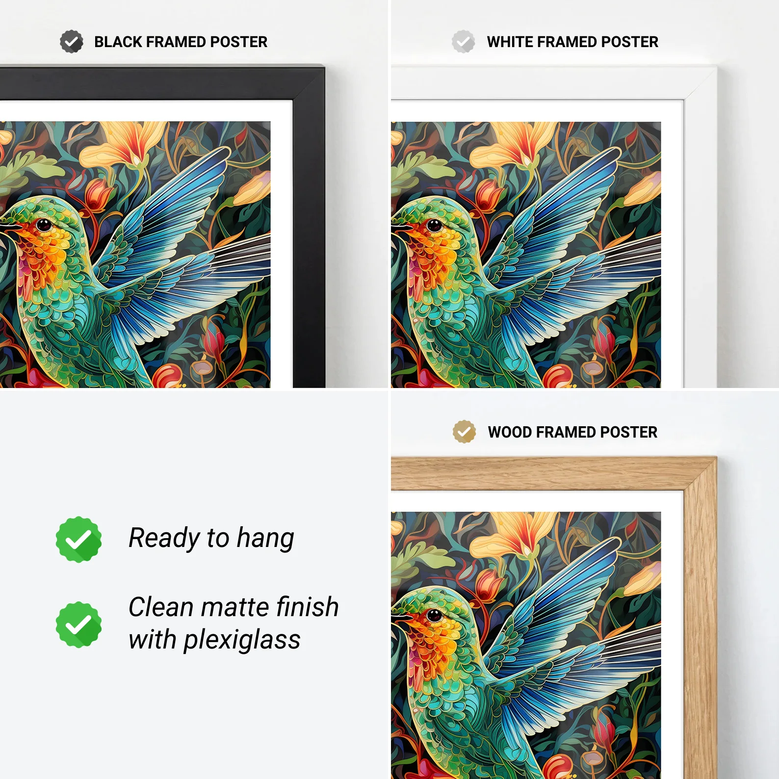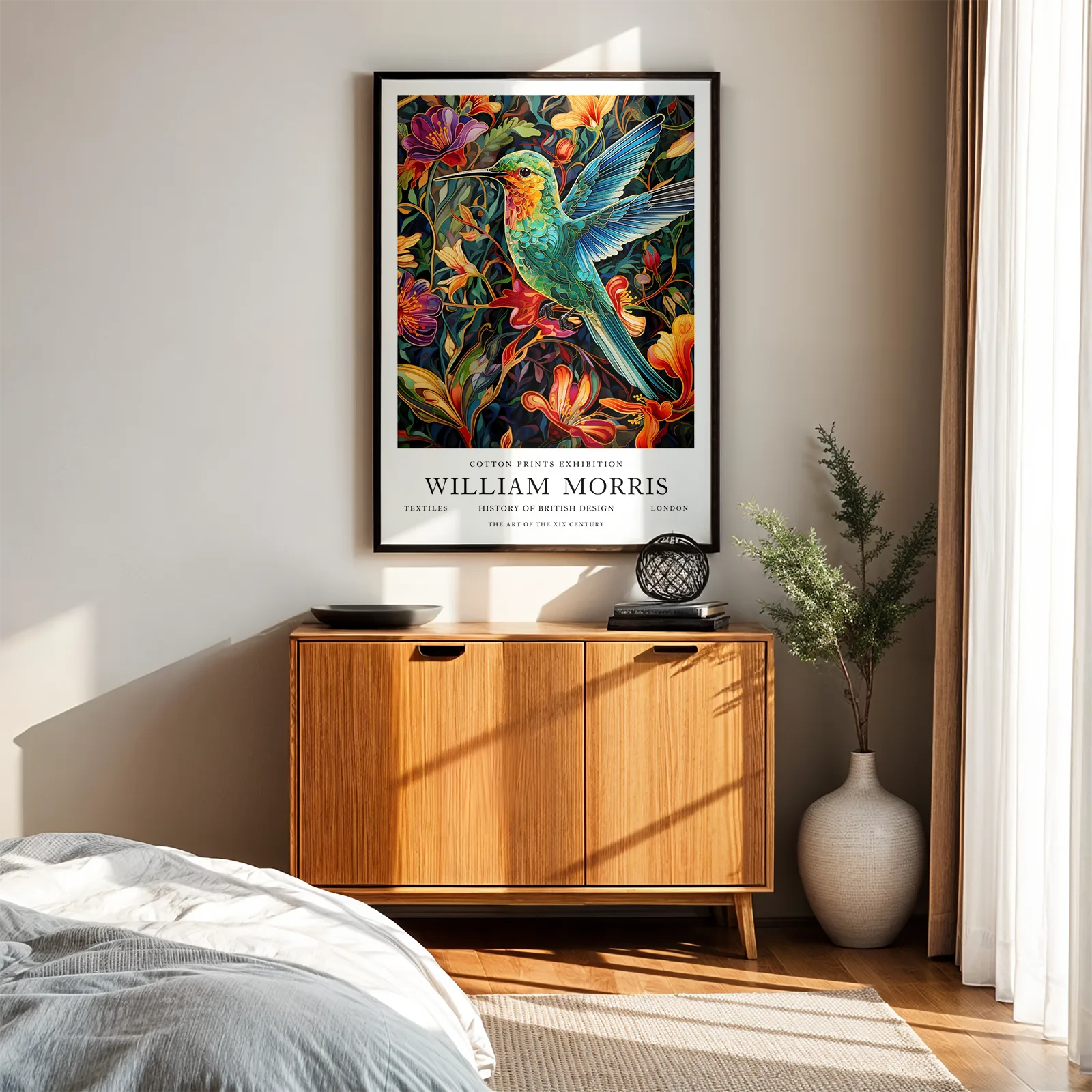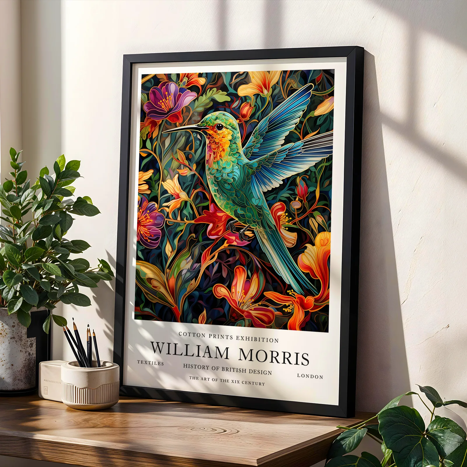 Bright flowers and deep forest tones surround the bird in this hummingbird poster, inspired by the work of William Morris. The vivid blue, green, and orange feathers stand out beautifully against the dark background, creating a bold yet balanced look. The detailed floral pattern adds movement and energy to the design. It fits perfectly in a living room, bedroom, or creative space where you want something colorful and unique. Printed on high quality paper, every detail shines in this hummingbird poster for your home.