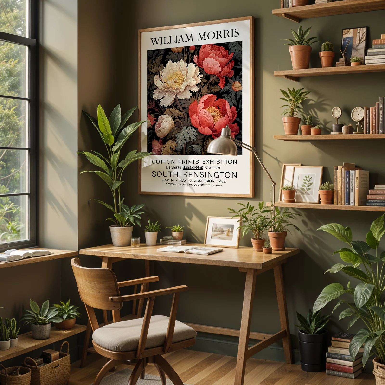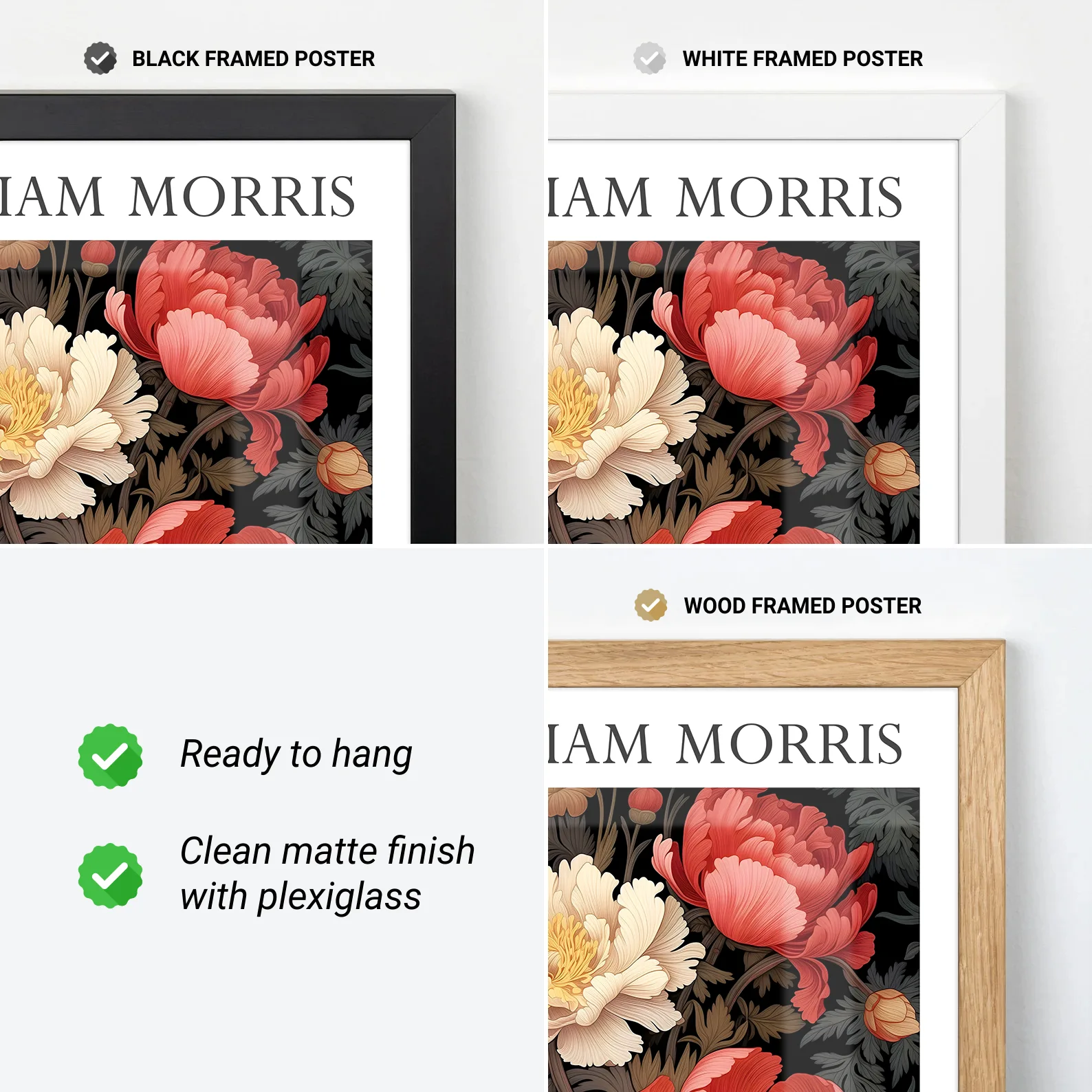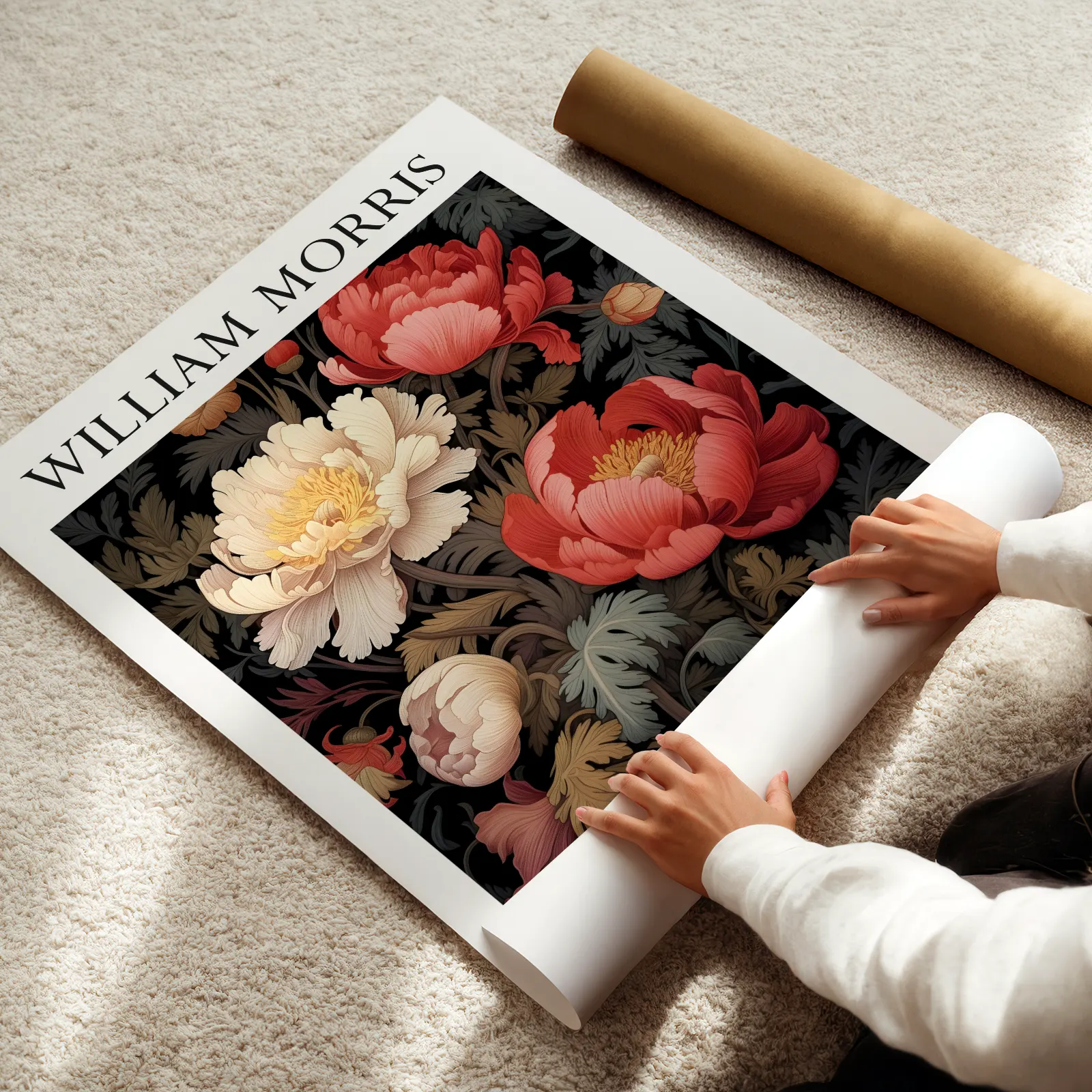 Soft yet full of character, this peonies art print draws inspiration from the timeless floral patterns of William Morris and classic decorative art. Large blooming flowers in warm red and creamy white tones create a romantic and elegant mood that fits beautifully in a bedroom, living room, or hallway. The dark background adds depth, while the fine details stand out on high quality paper. Bring warmth, beauty, and natural charm into your space with this peonies art print inspired by William Morris.