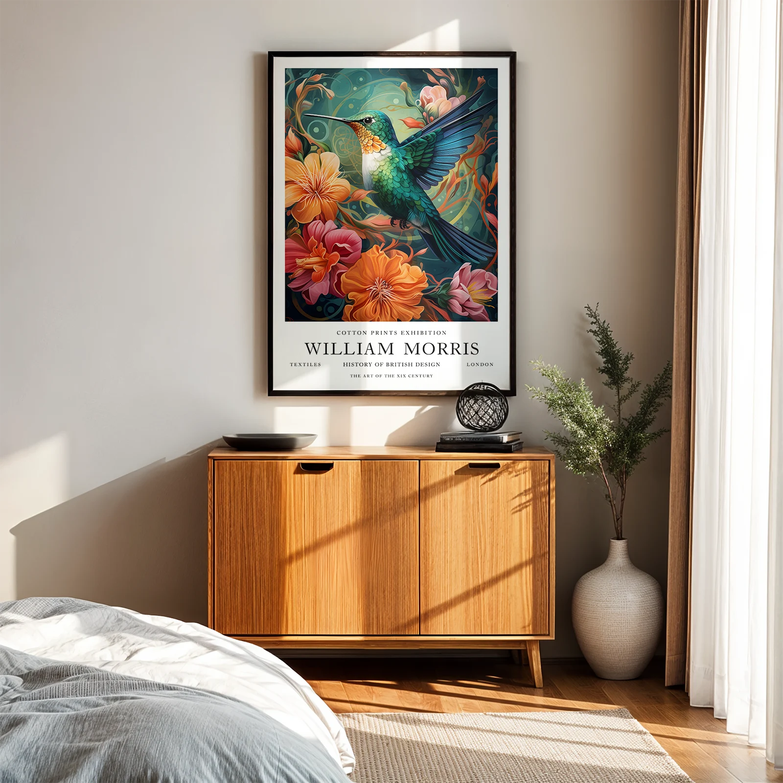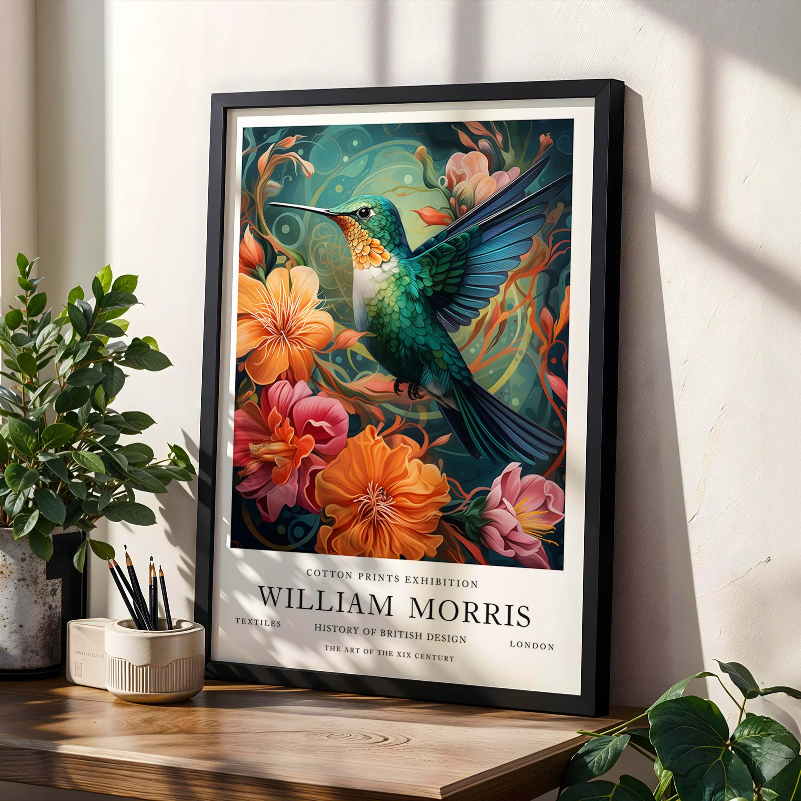 This hummingbird print is inspired by the decorative elegance of William Morris and brings vibrant color into your space. The rich green and blue tones of the bird contrast beautifully with the warm orange and pink flowers surrounding it. Flowing lines and layered details create depth and movement, giving the composition a lively yet balanced feel. This hummingbird print works perfectly in a living room, bedroom, or creative studio, adding energy, color, and timeless botanical charm to your interior.