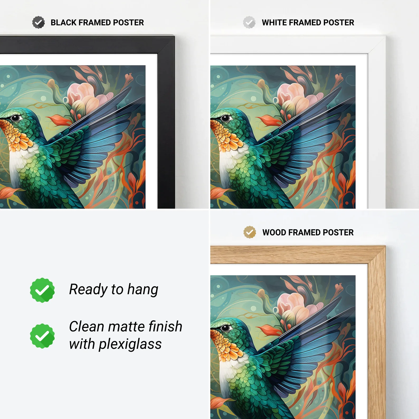 You can order our prints either framed or unframed. Our frames are crafted from lightweight pine wood, measuring 2 cm in width. Each frame includes an acrylic front protector and hanging hardware for easy setup.