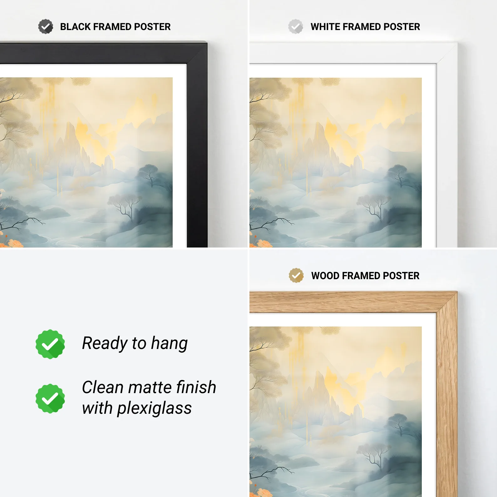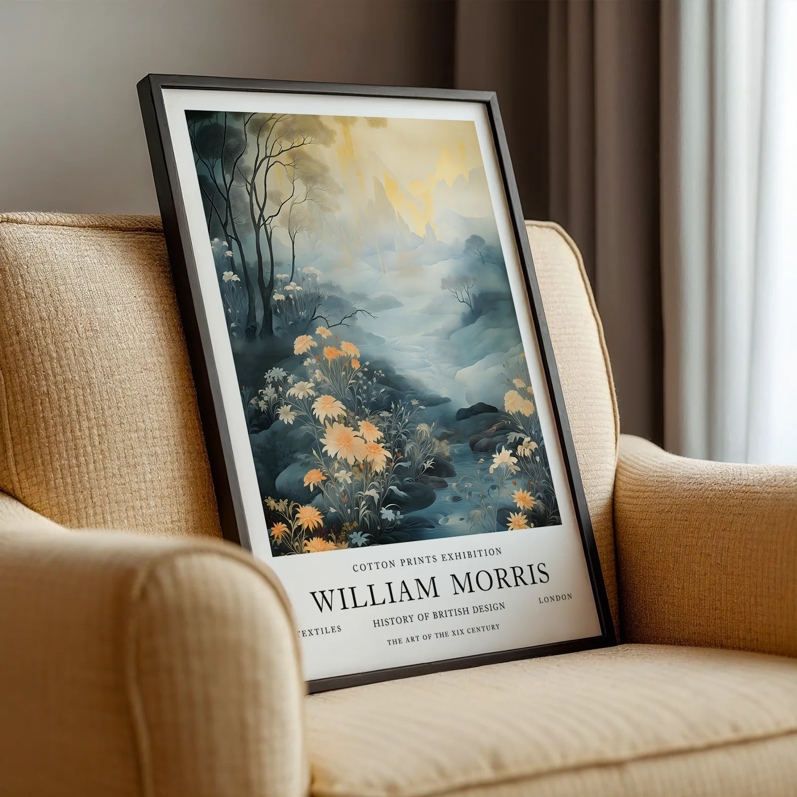 This landscape print is inspired by the decorative elegance of William Morris and captures a peaceful natural scene. Soft misty blues blend with warm golden light, while delicate flowers and flowing water create a sense of calm movement. The balanced composition and gentle color palette make it easy to style in both modern and classic interiors. This landscape print brings serenity to a living room, bedroom, or office, adding depth and quiet beauty to your space with its timeless nature inspired design.