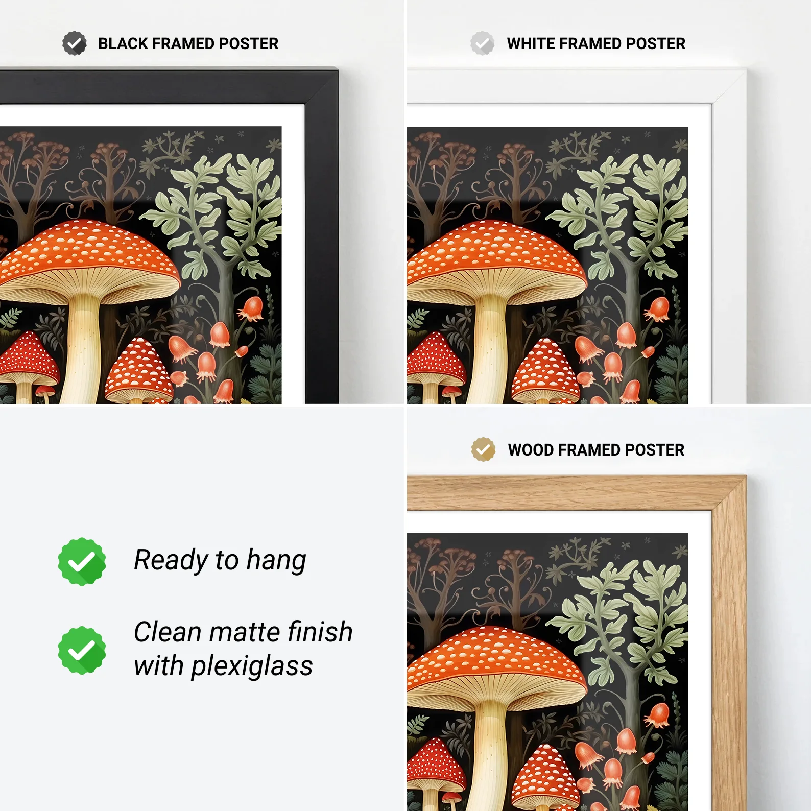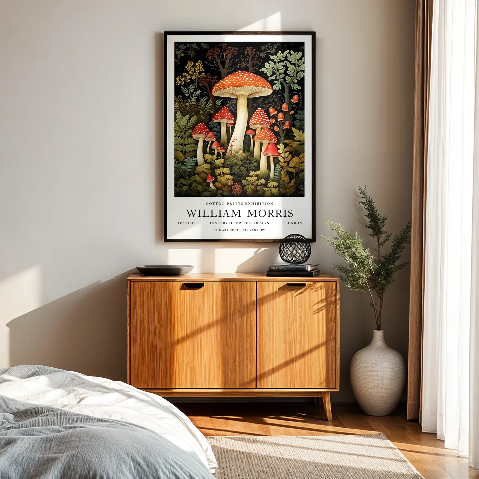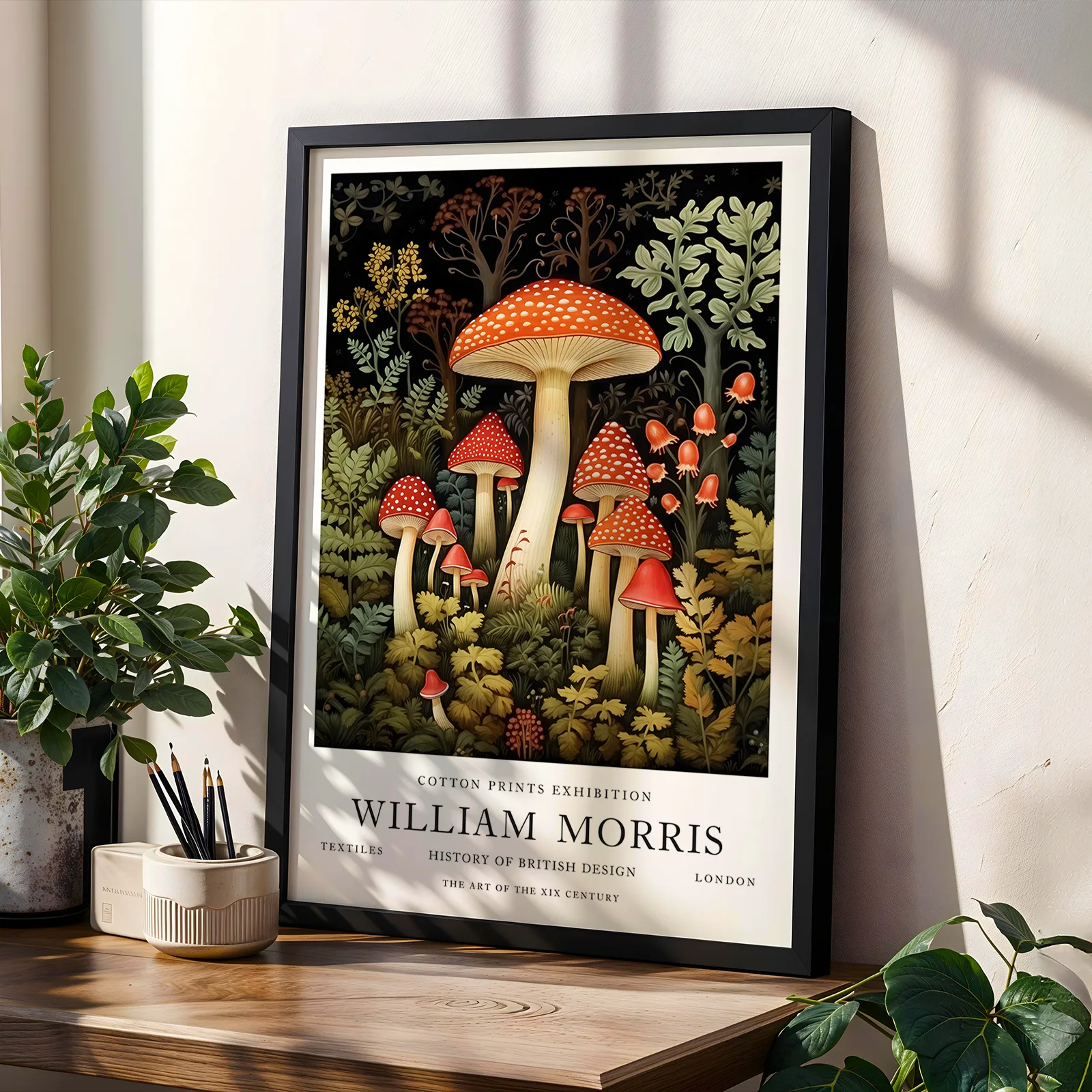 Rich forest colors and bright red caps stand out in this mushroom print, inspired by the work of William Morris. The dark background makes the warm reds and soft greens look deep and full of life. Small plants and delicate details add movement and charm to the design. It fits beautifully in a living room, study, or creative space where you want something eye catching. Printed on high quality paper, the artwork looks clear and detailed in this mushroom print for your home.