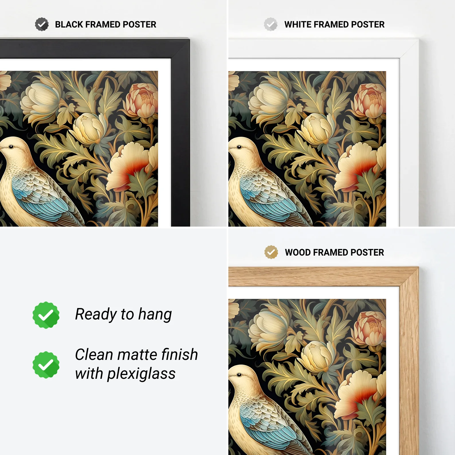 You can order our prints either framed or unframed. Our frames are crafted from lightweight pine wood, measuring 2 cm in width. Each frame includes an acrylic front protector and hanging hardware for easy setup.