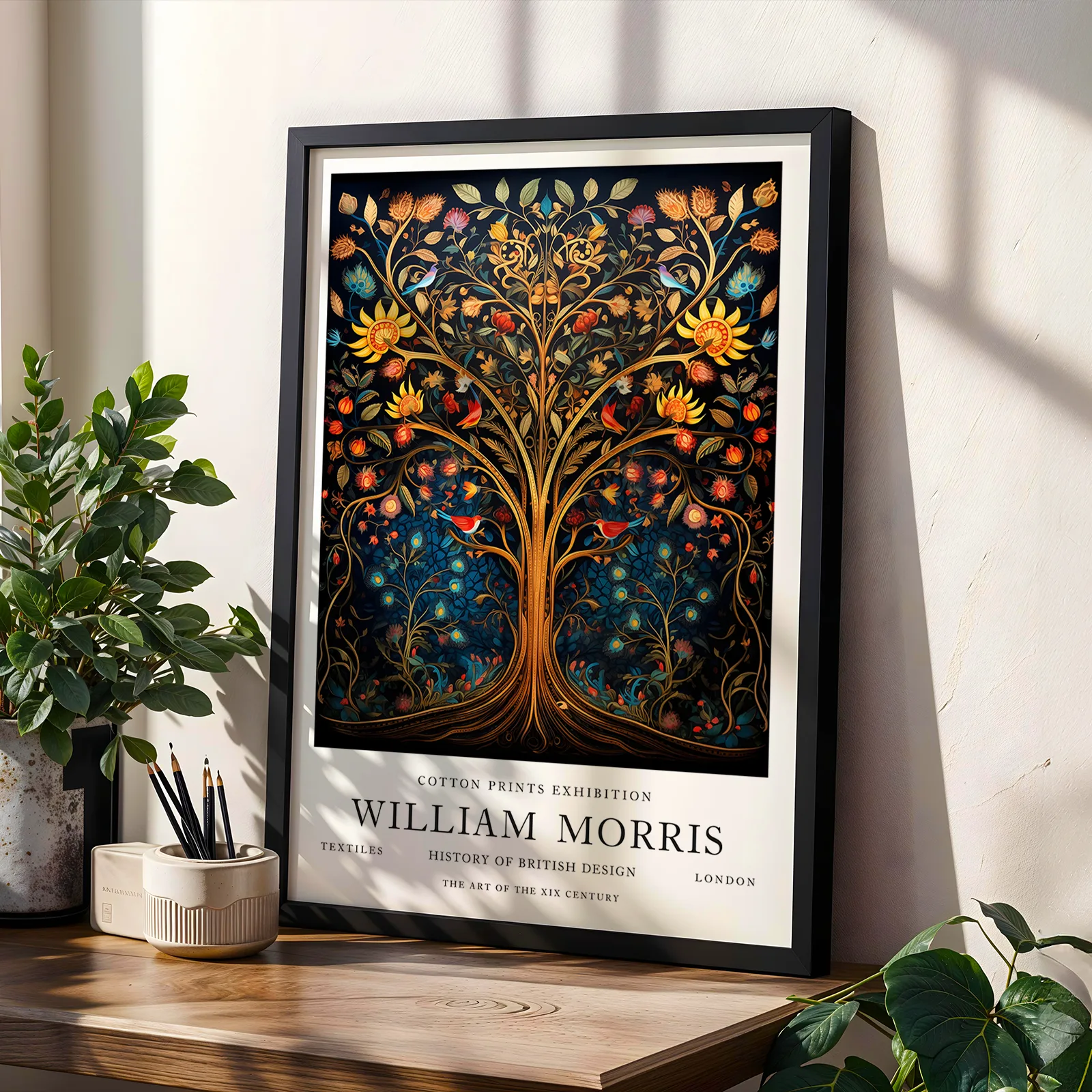 Rich colors and flowing branches come together in this tree of life poster, inspired by the work of William Morris. The deep blue background makes the warm gold, red, and green tones stand out beautifully. Small birds and delicate flowers add life and movement to the design, drawing your eye to every detail. It fits perfectly in a living room, office, or creative space. Printed on high quality paper, the artwork looks clear and detailed. Bring warmth and style to your home with this tree of life poster.